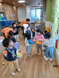 その後は、手作り豆箱を持って豆まきをしました。