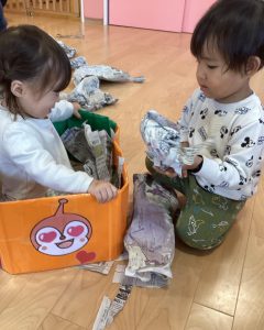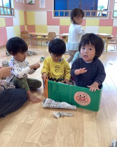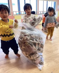 破った新聞を協力して箱の中に集めたり、、