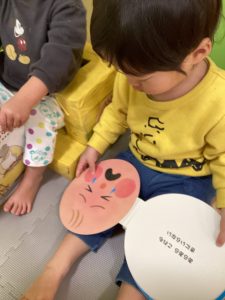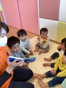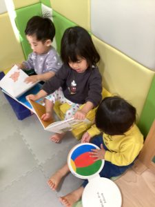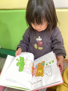 今日はトイレの順番待ちなど生活のちょっとした隙間時間に絵本を楽しんでいる子ども達の様子をお伝えます😌