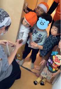 りんご組のお友達が代表して給食の先生の所まで
