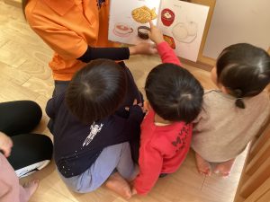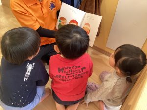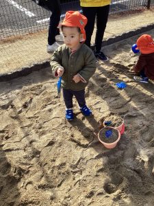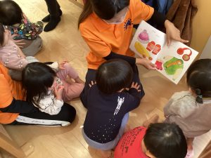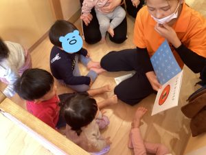 今回は一歳児クラスいちご組さんが戸外遊びにいく前の