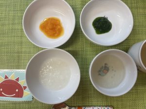 (写真は離乳食後期です。年齢によって形、固さ、盛り付け量を変えて、提供しています。)