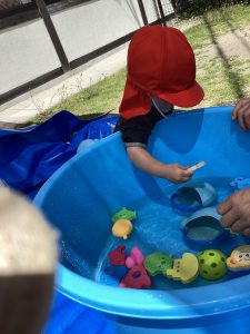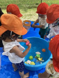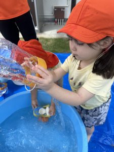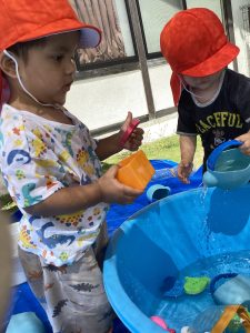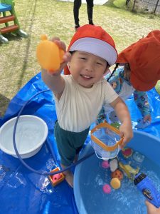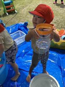 初めての保育園での水遊びのお友だちも、興味津々にしており、どんどん水に触れて遊んでいました🙄