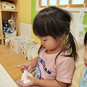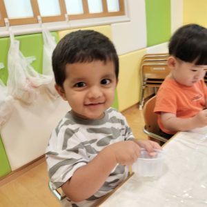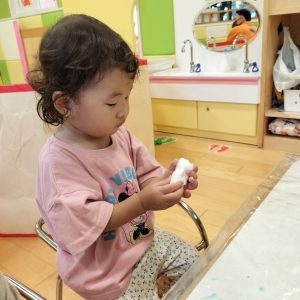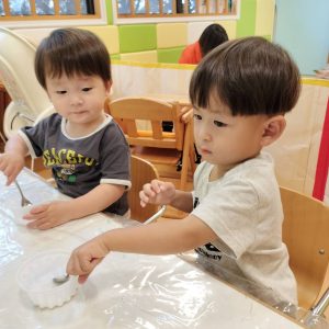 今週のブログは、先日行いました1歳児クラスの片栗粉粘土で感触遊びの様子をお届けします✨