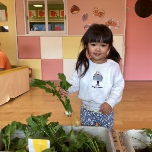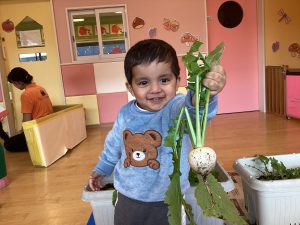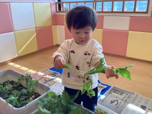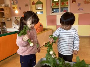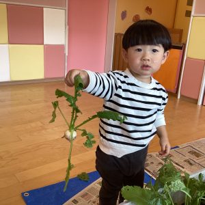 園庭のプランターで夏の終わりにみんなで種まきをしたかぶが大きく育ったので、みんなで収穫をしました!