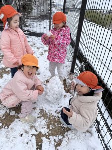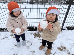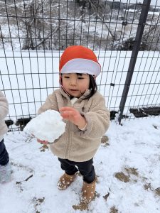今月の歌が『ゆき』と『雪のこぼうず』で、毎日歌っていましたが、なかなか本物の雪を見ることができなかったので、雪遊びができて良かったです。子どもたちも大喜びでした!