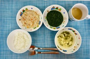 (写真は普通食です。年齢によって盛り付け量を変えて、提供しています。)