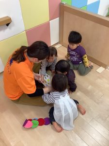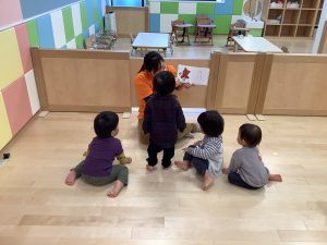 おもちゃで遊んでいる時は、好きなおもちゃの場所で遊ぶので、みんなバラバラのところにいるのですが、「絵本を見ようかなぁ」と保育者が声をかけると、集まってきてくれます