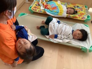 「ねんねしようね〜」と誘いかけると、戸惑う事なくコットにゴロンと横になりスヤスヤ眠っていました。まだまだ保育者の抱っこの方が安心して、眠れる子どもたちもいますが、それぞれ、安心できる眠り方でグッスリでした![]()