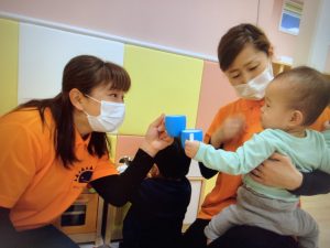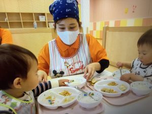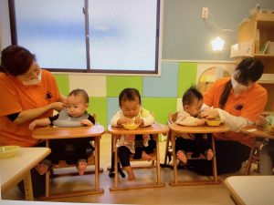 今週から給食もはじまり、ごはんの時間になると、保育者と一緒に手を洗い、椅子に座り、食べさせてもらったり、自分で食べたりしながら、喜んでいます。それぞれ好みはありますが、「おいしいね!」と声をかけると、「うんうん」と頷いたり、大きな口をあけて〝あ〜ん〟と食べたり楽しい雰囲気で食事をしています。
