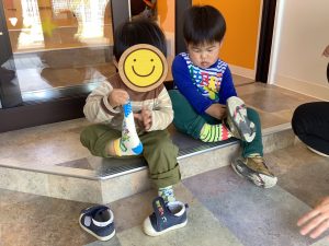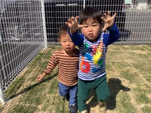 もも組、いちご組の子どもたちも保育者と一緒に靴下や靴をはき、玄関前の園庭に出て、心地よい風を感じたり、おひさまをたくさん浴びてニコニコでし