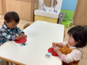 シールに興味はあるものの〝どうやってするのかなぁ?〟と台紙からシールをはずせず苦戦する子どもたち。シールの端に折り目をつけて、はがしやすくしたり、保育者がシールを手渡しすると、うまく持ちかえて、ペタッと上手に貼っていました