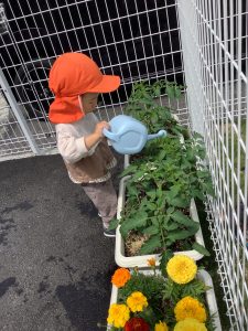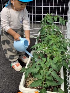 〝りんご組〟のお友だちのお手伝いをして、トマト?の水やりを頑張ってくれています![]()
