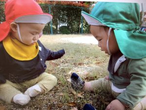 草の上に座って足元の草花や落ち葉を触ったり、いろいろな事に興味津々![]()