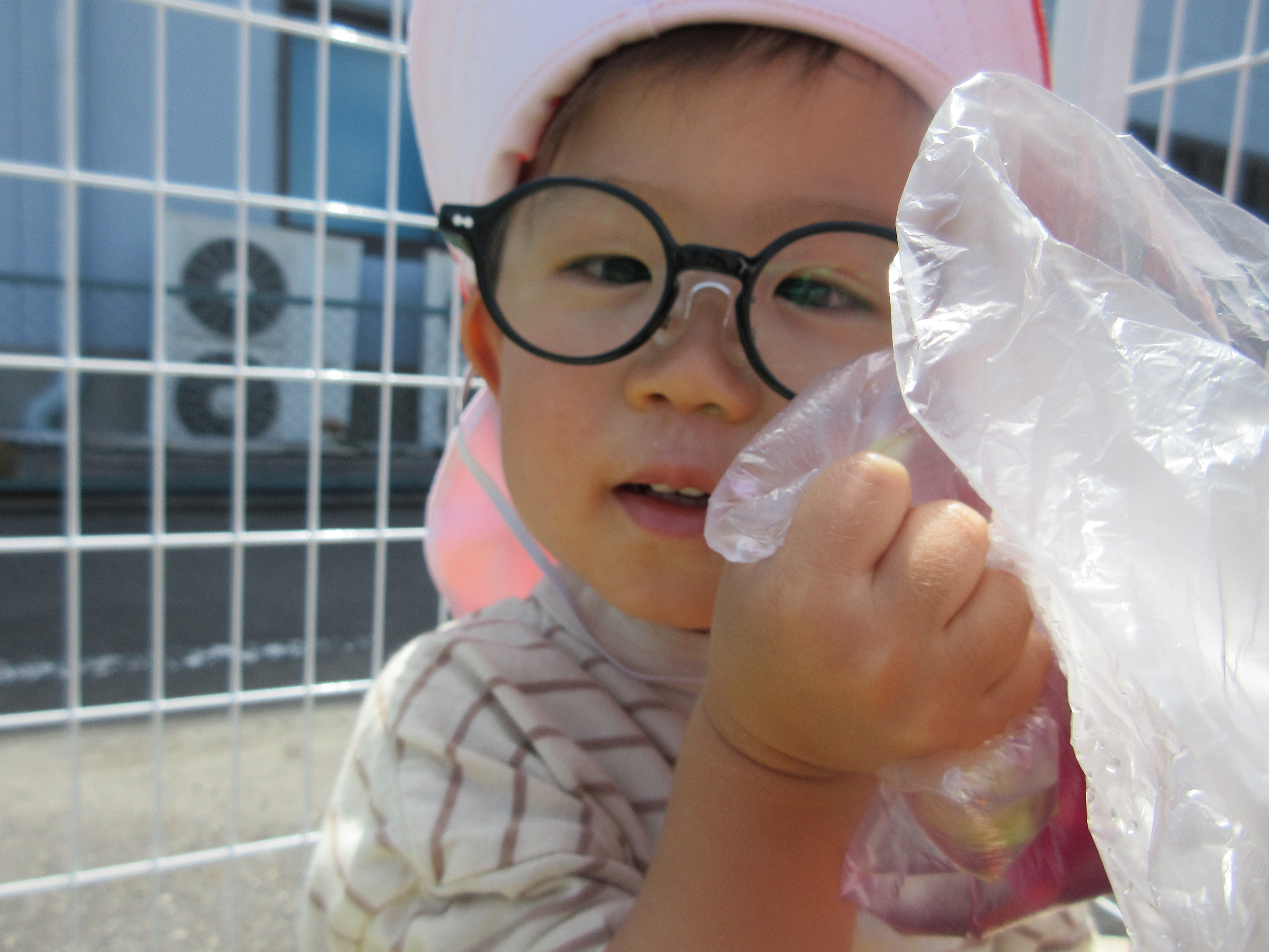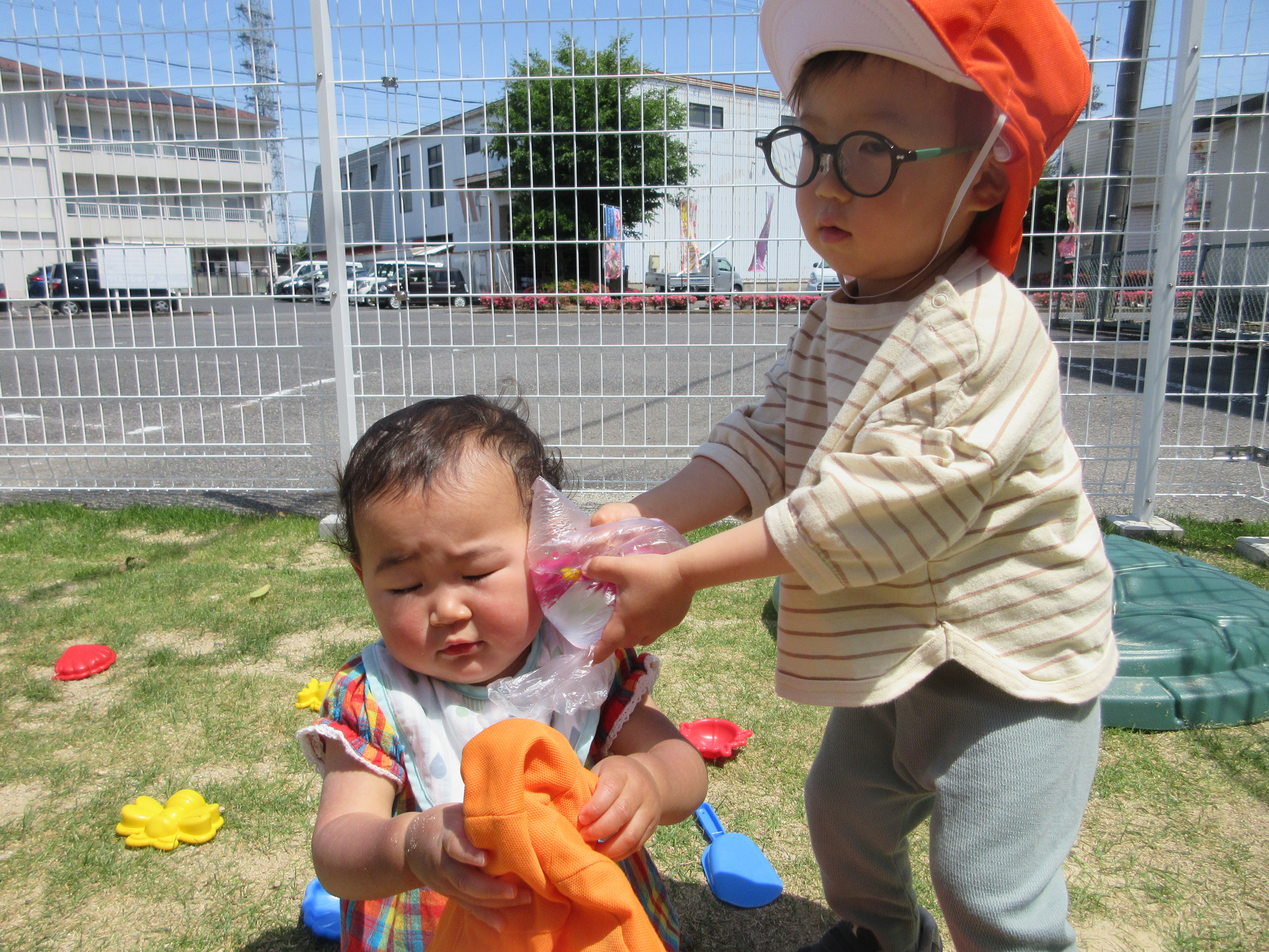 「ほら?つめたいでしょ?!」と、もも組のお友だちのほっぺにくっつけてあげる優しい いちご組のお兄さんです♡