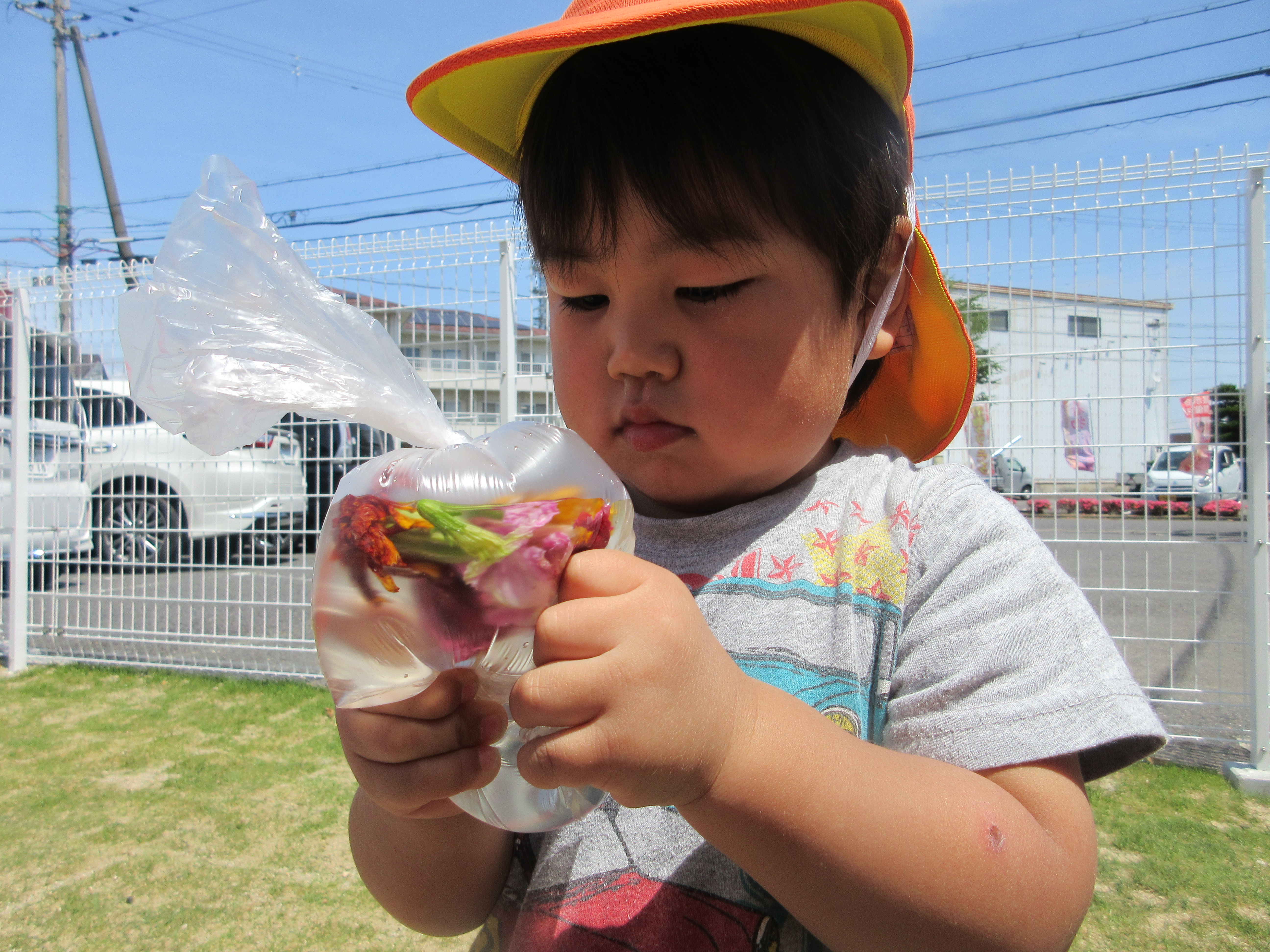 りんご組のお友だちは袋をムニュムニュして、中のお花(咲き終えたもの)を揉んで、色水作りを楽しんでいます♬ムニュムニュの感触が気持ちよくて夢中です✨