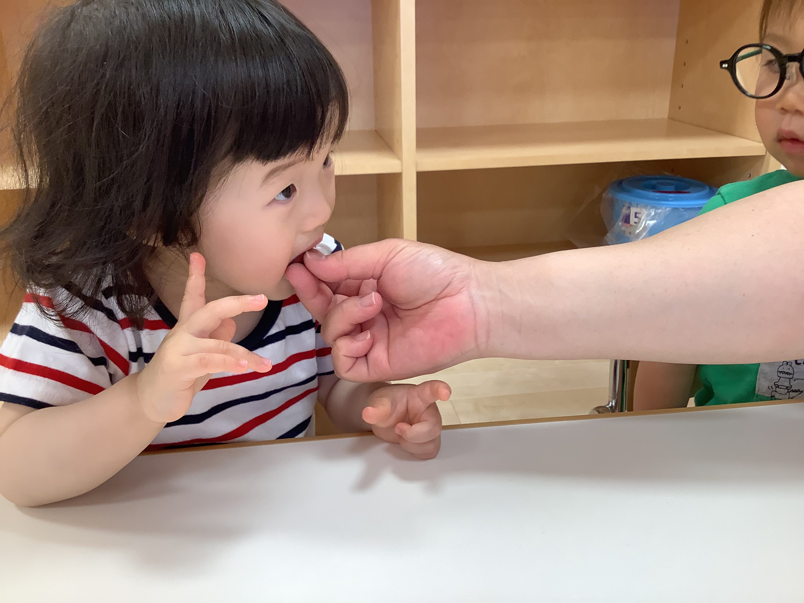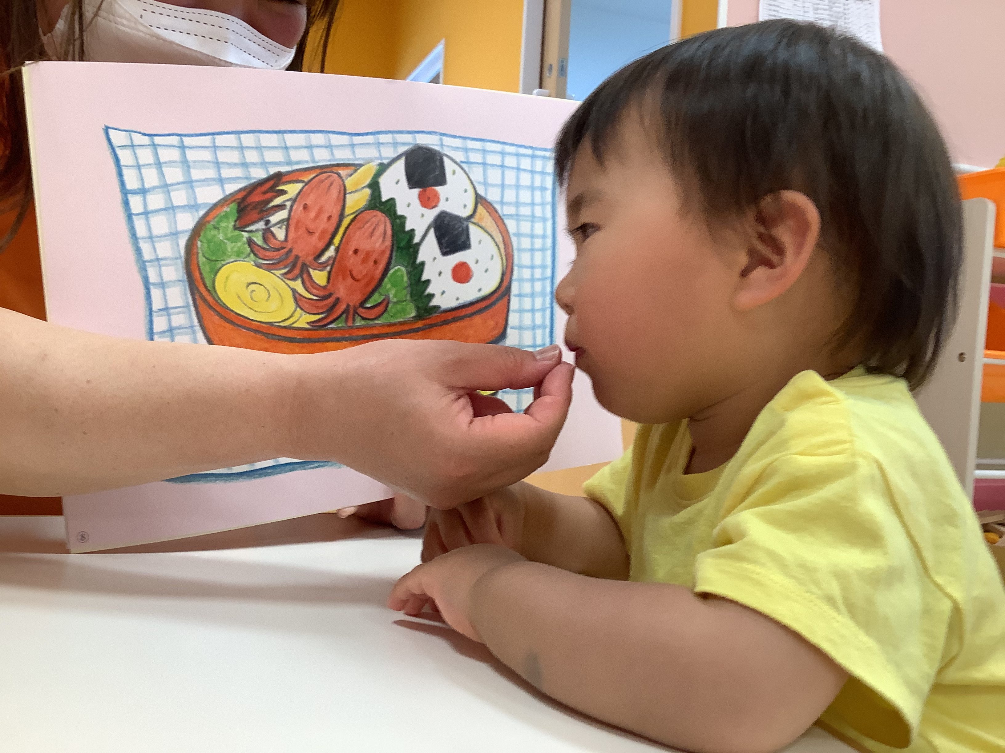 保育者が「どーぞ!」とお弁当のおかずを手で、つかむフリをして口元までもっていくと………〝あむっ(^^)〟と食べるマネ✨