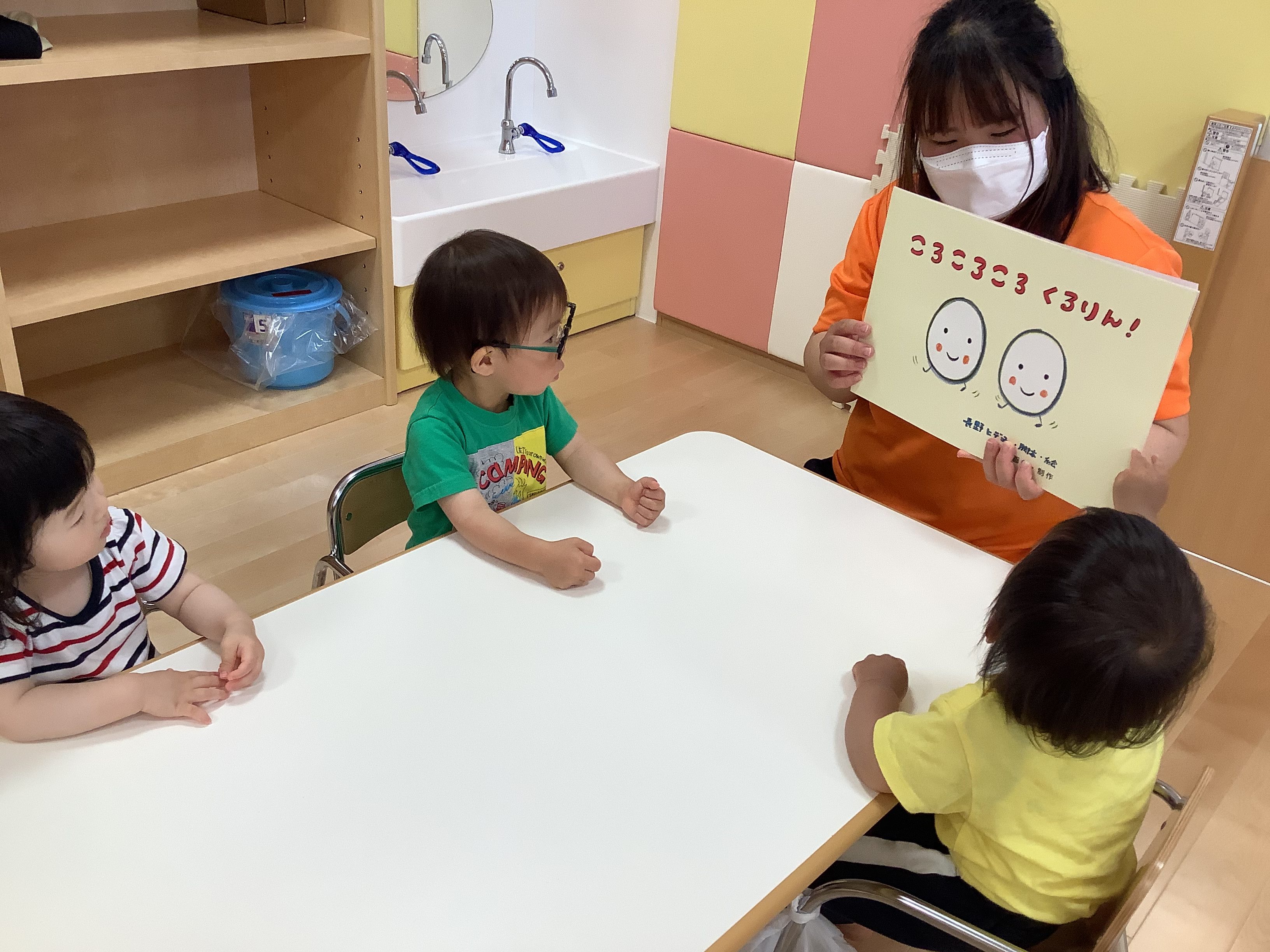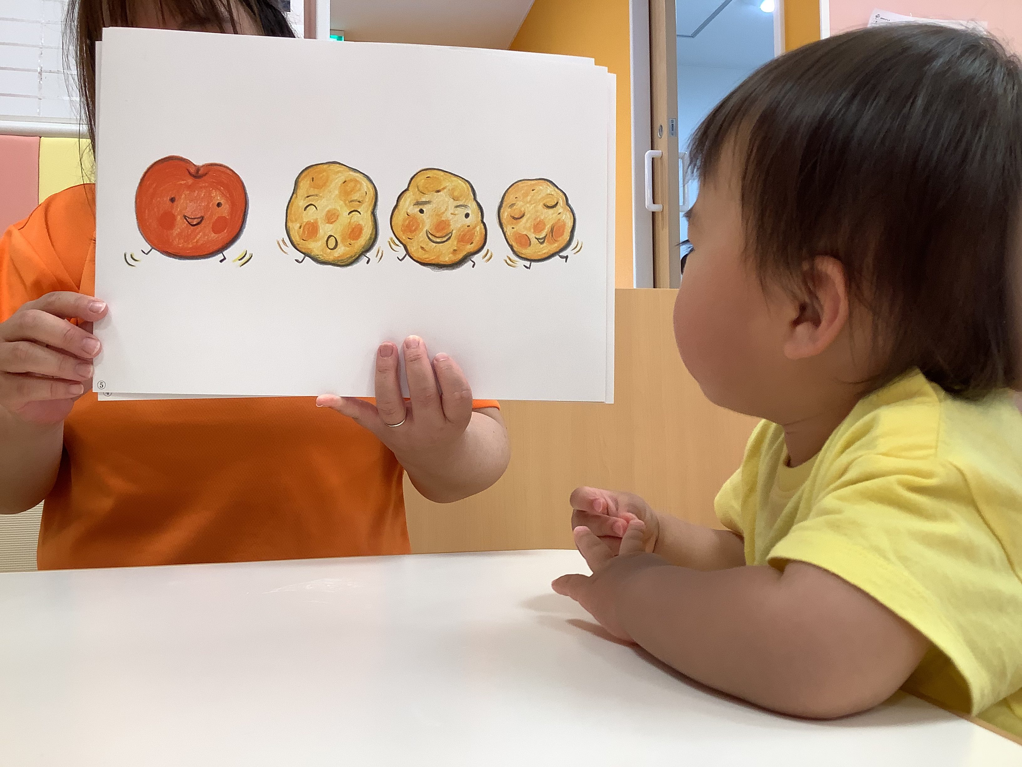 今日は一歳児の給食前の紙芝居をみている様子を紹介します♬
