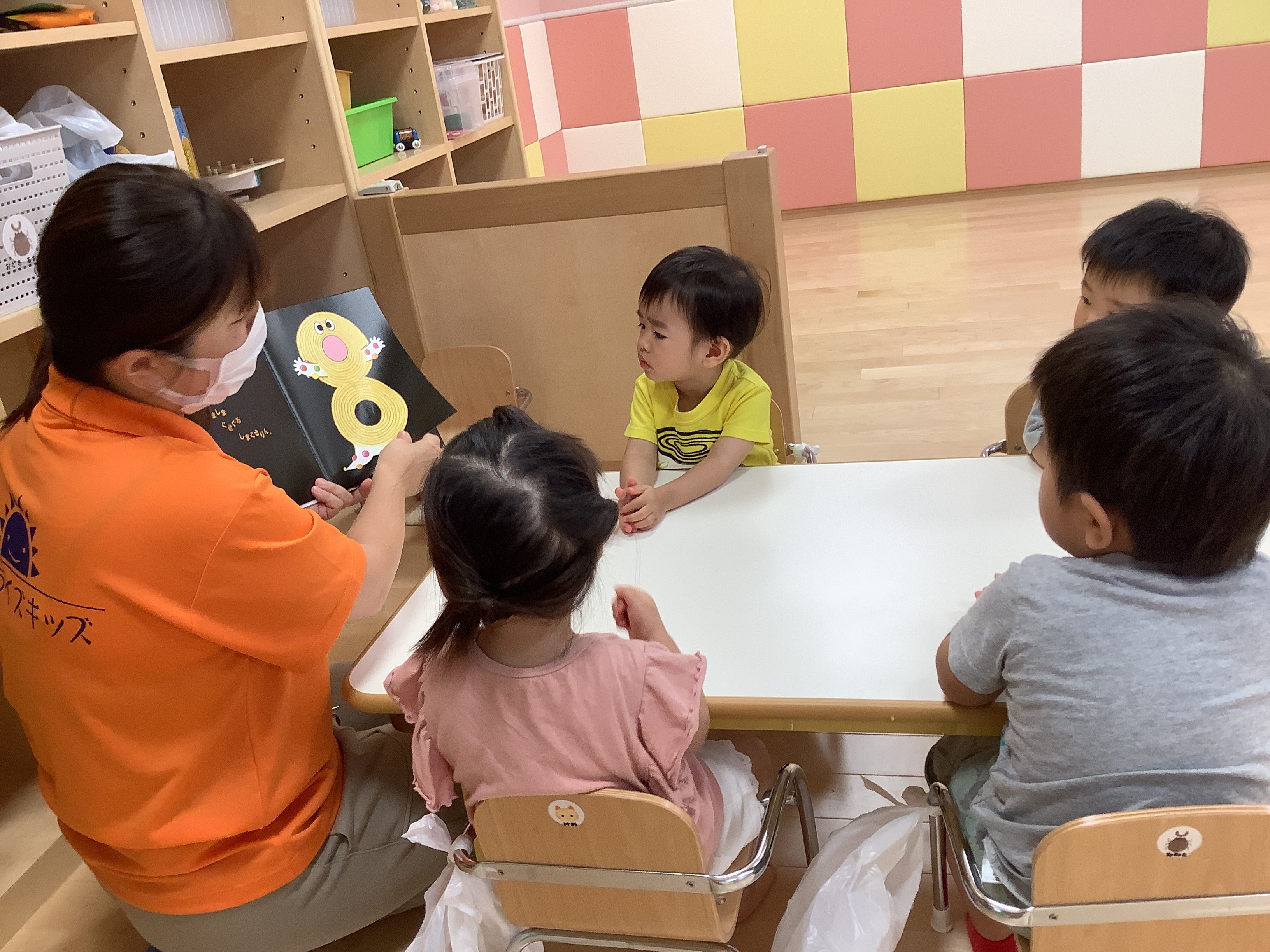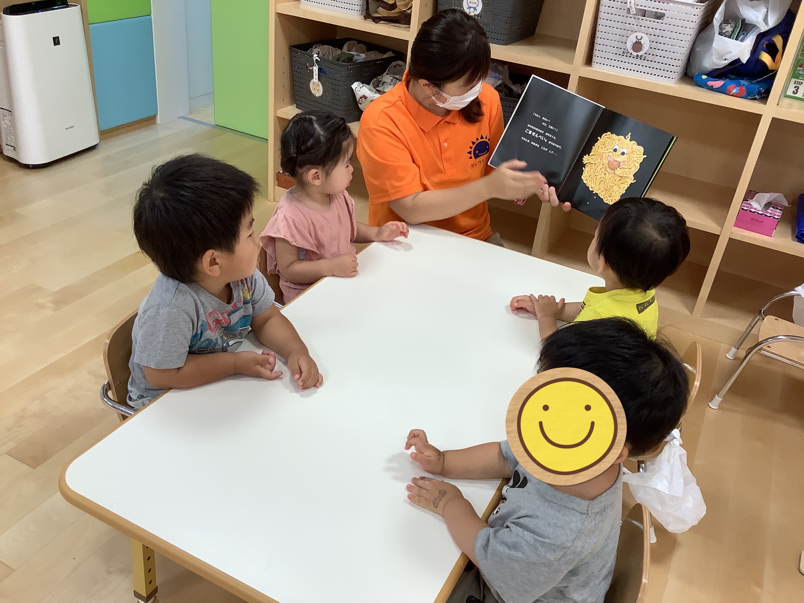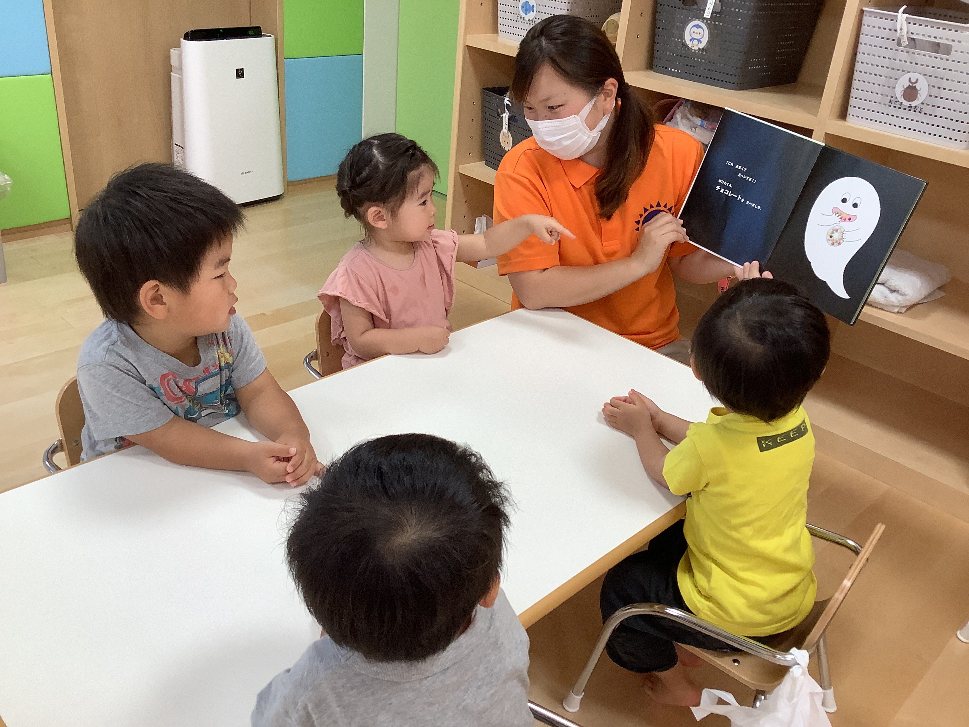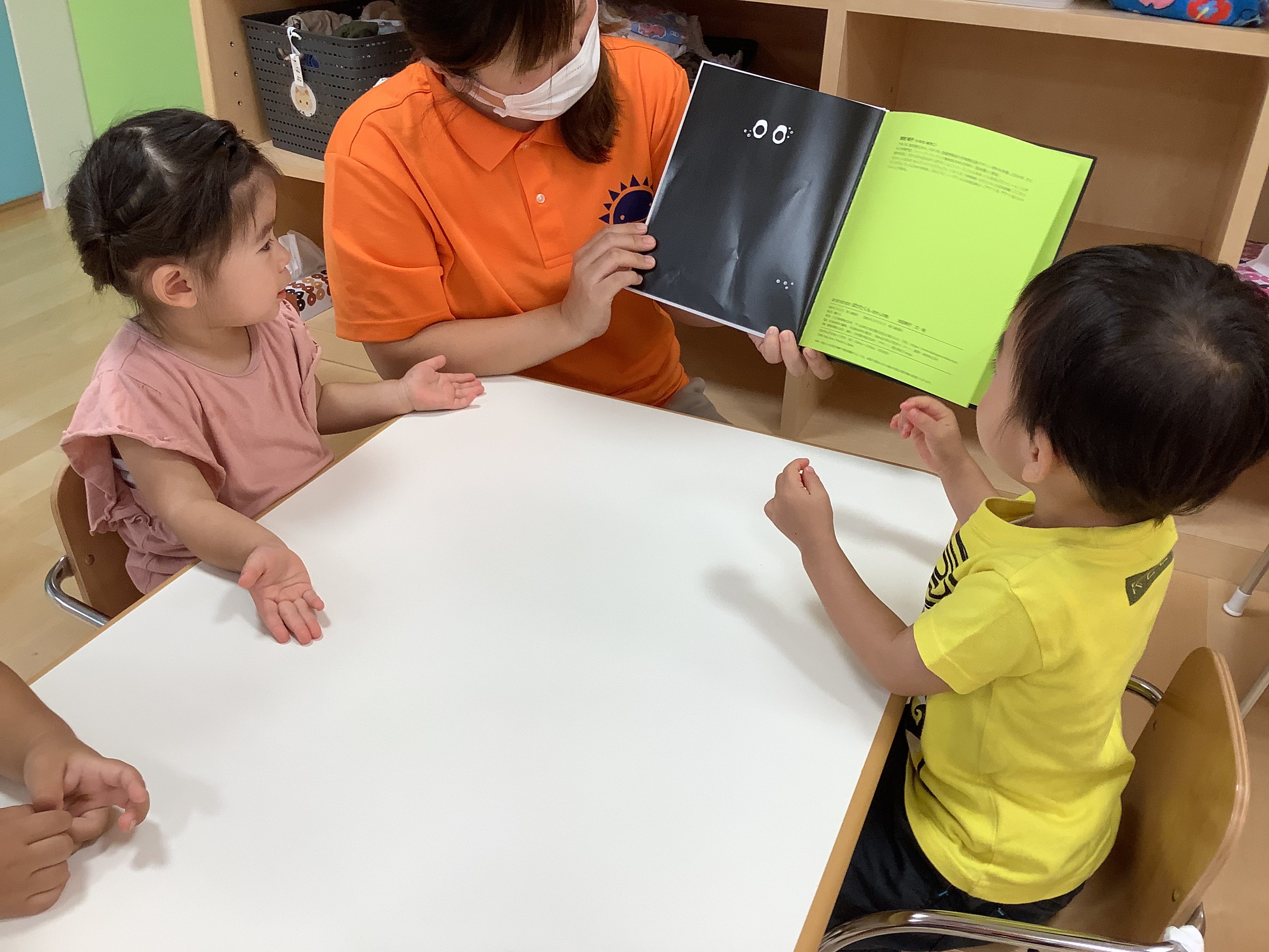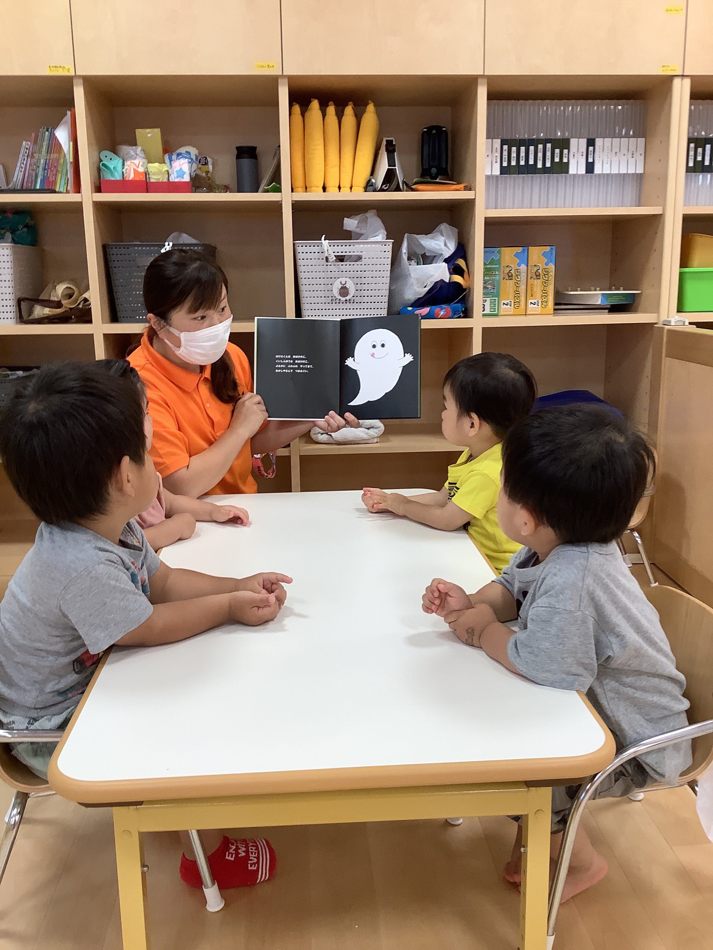 今週は「ばけ ばけ ばけ ばけ ばけたくん!!?」の絵本を2歳児の子どもたちが見ている様子を紹介します‼️