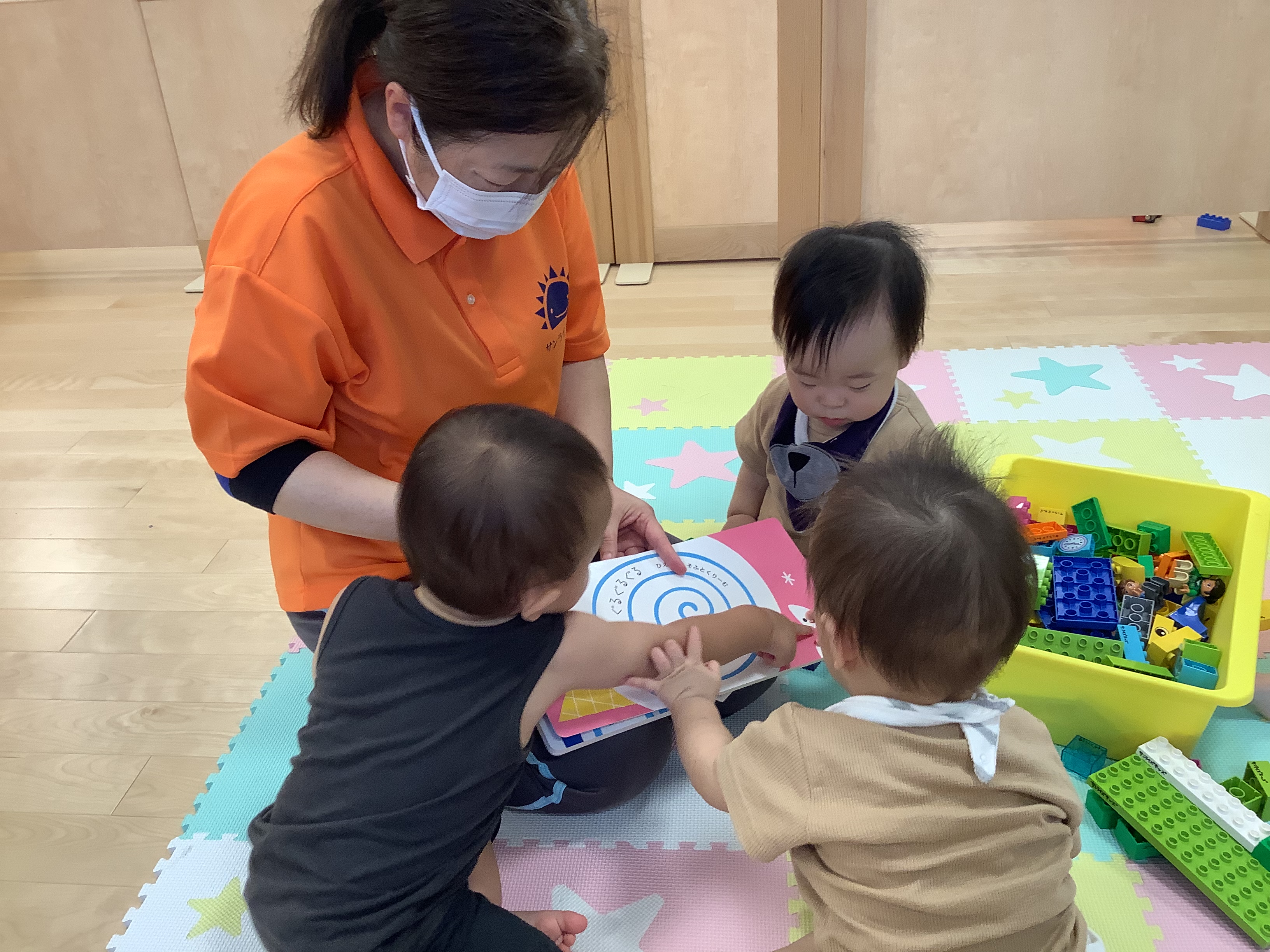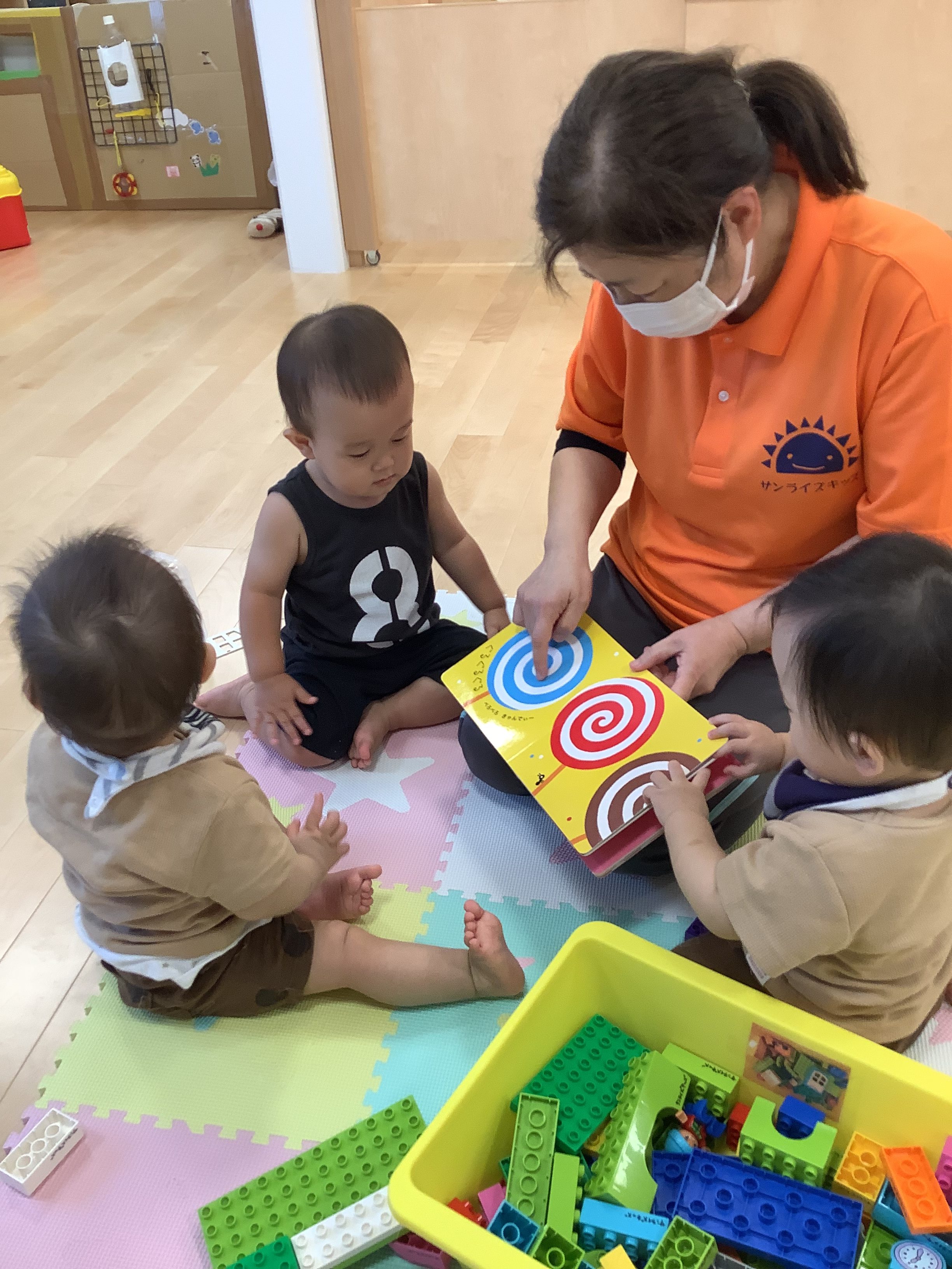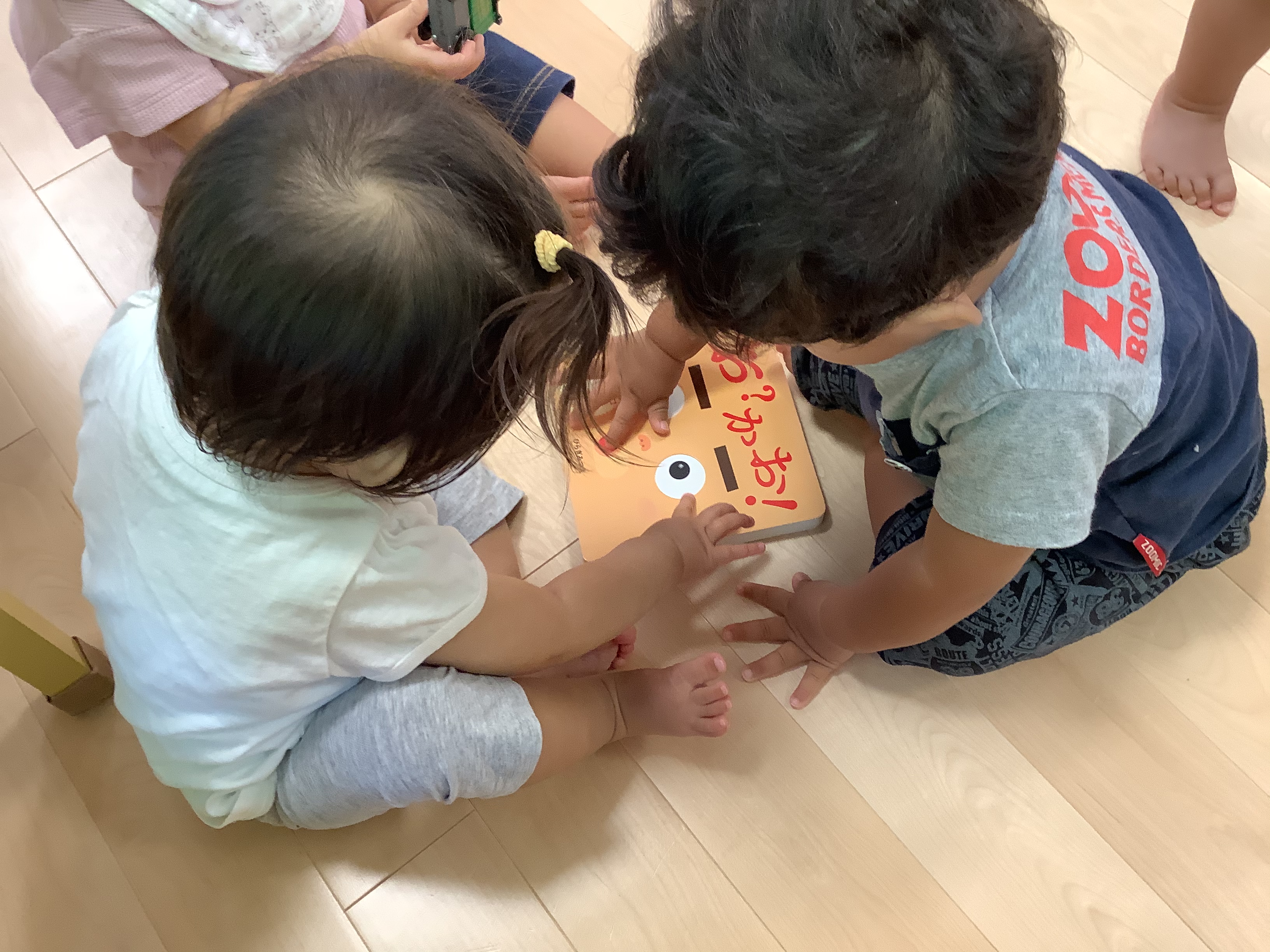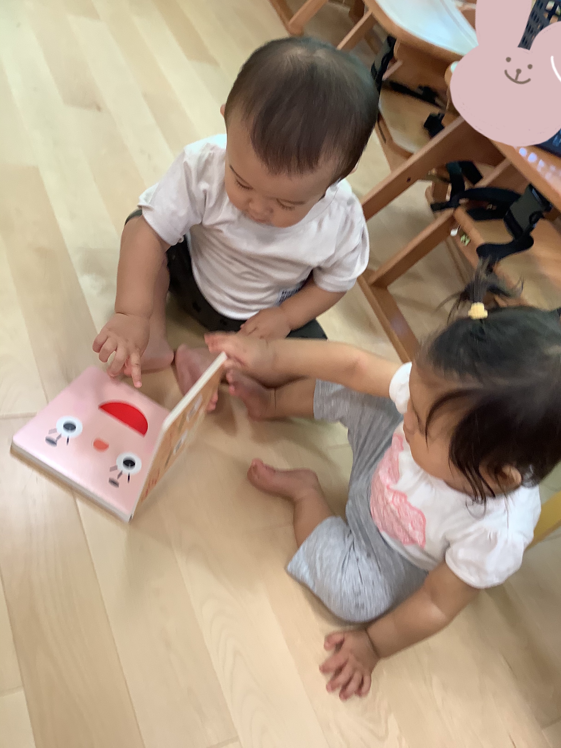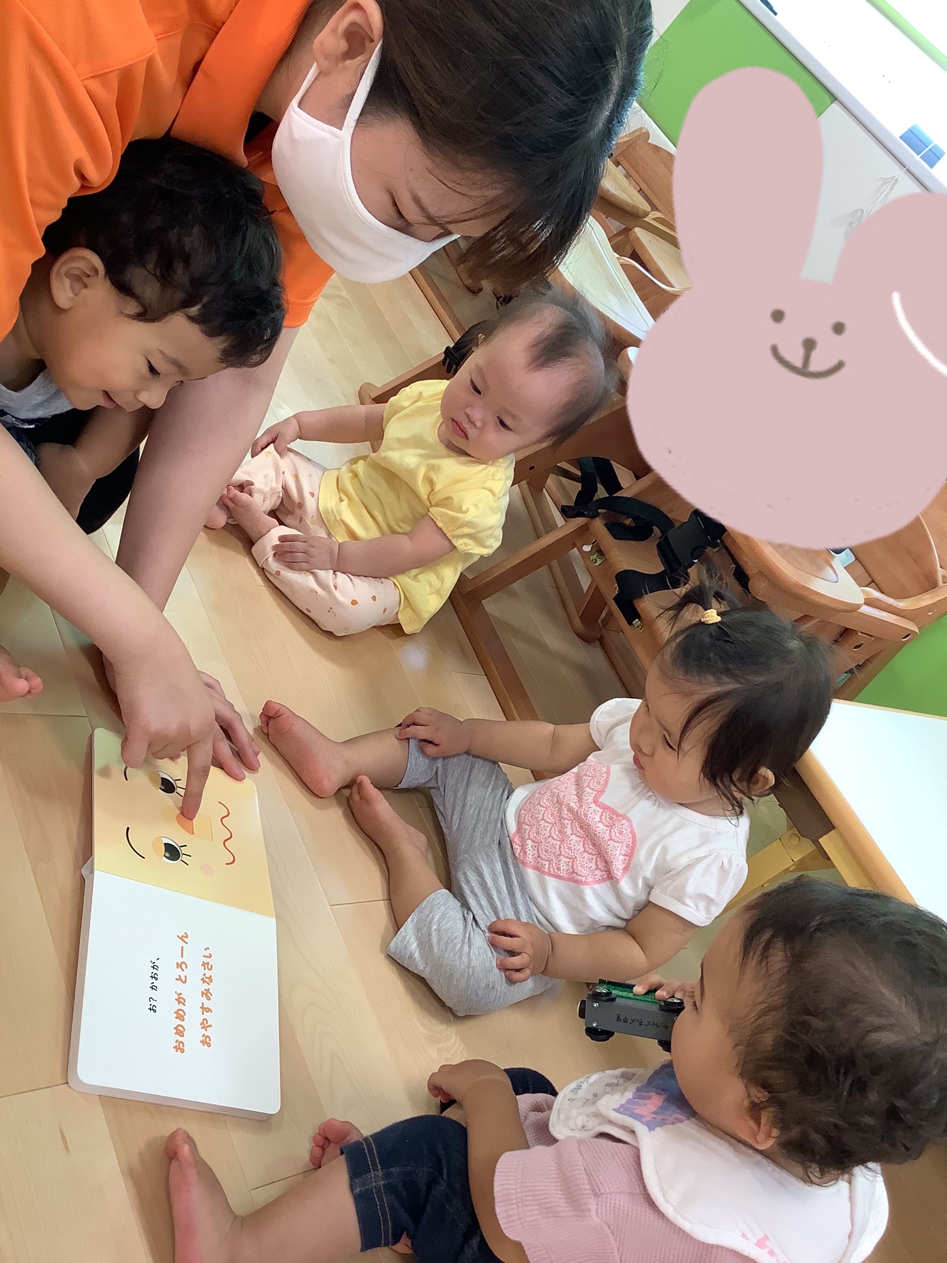 今週は0歳児(もも組?)の子どもたちが絵本をみている様子を紹介します?✨