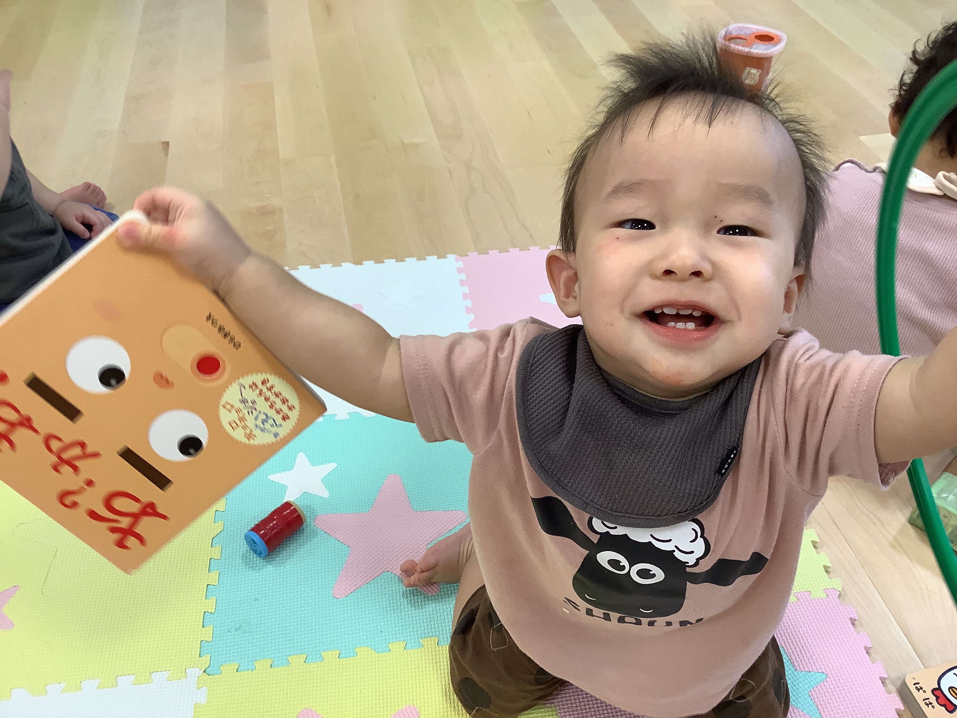 絵本をみるのが楽しくて机を揺らしたり〝バンバン〟叩いたりして嬉しい気持ちを全身で表現中✨