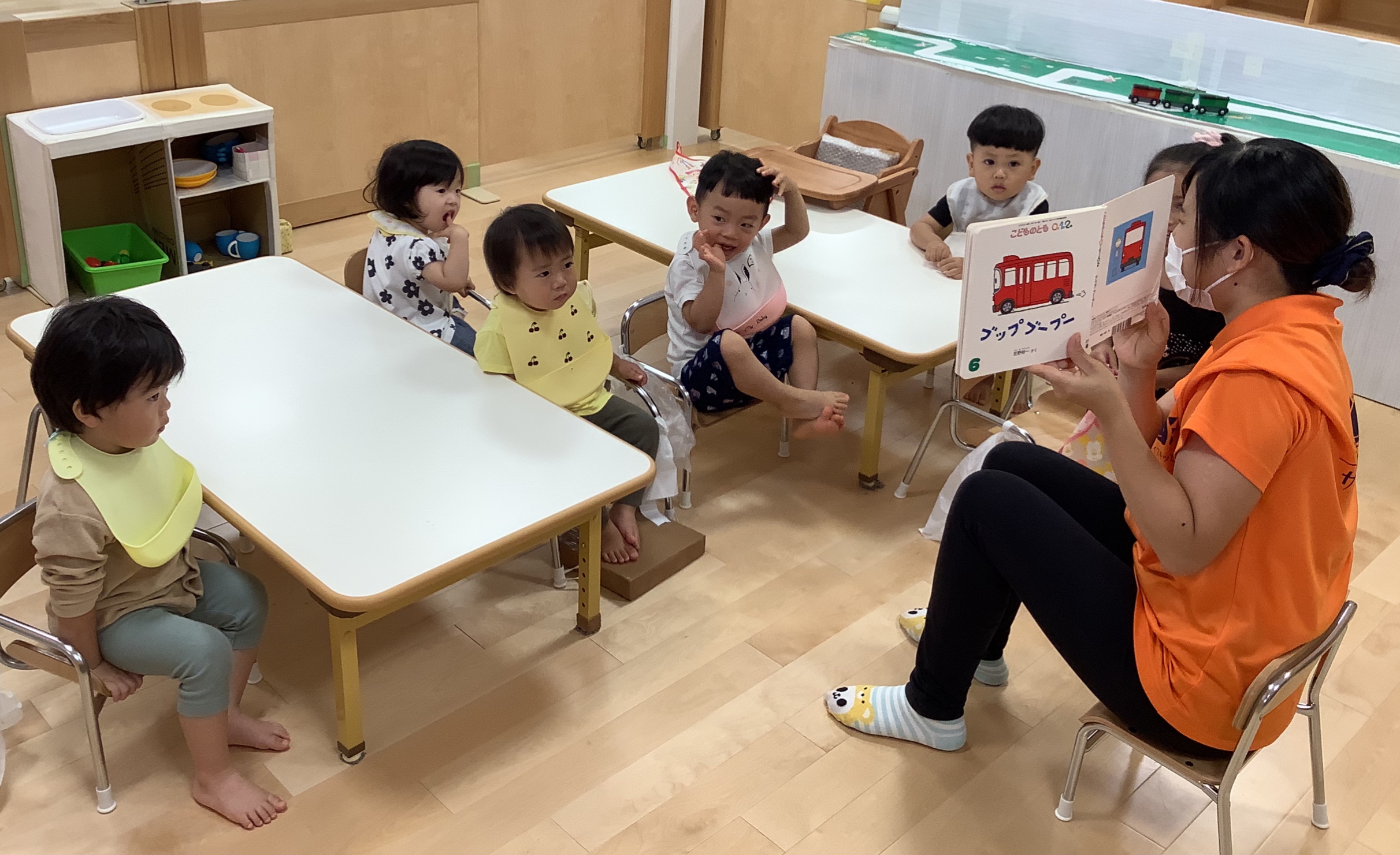 『プップ ブープー』の絵本にはバスが出てくるので、乗り物が好きな子どもたちが多い〝いちご組?〟のお友だちは喜んで見ています(≧∀≦)