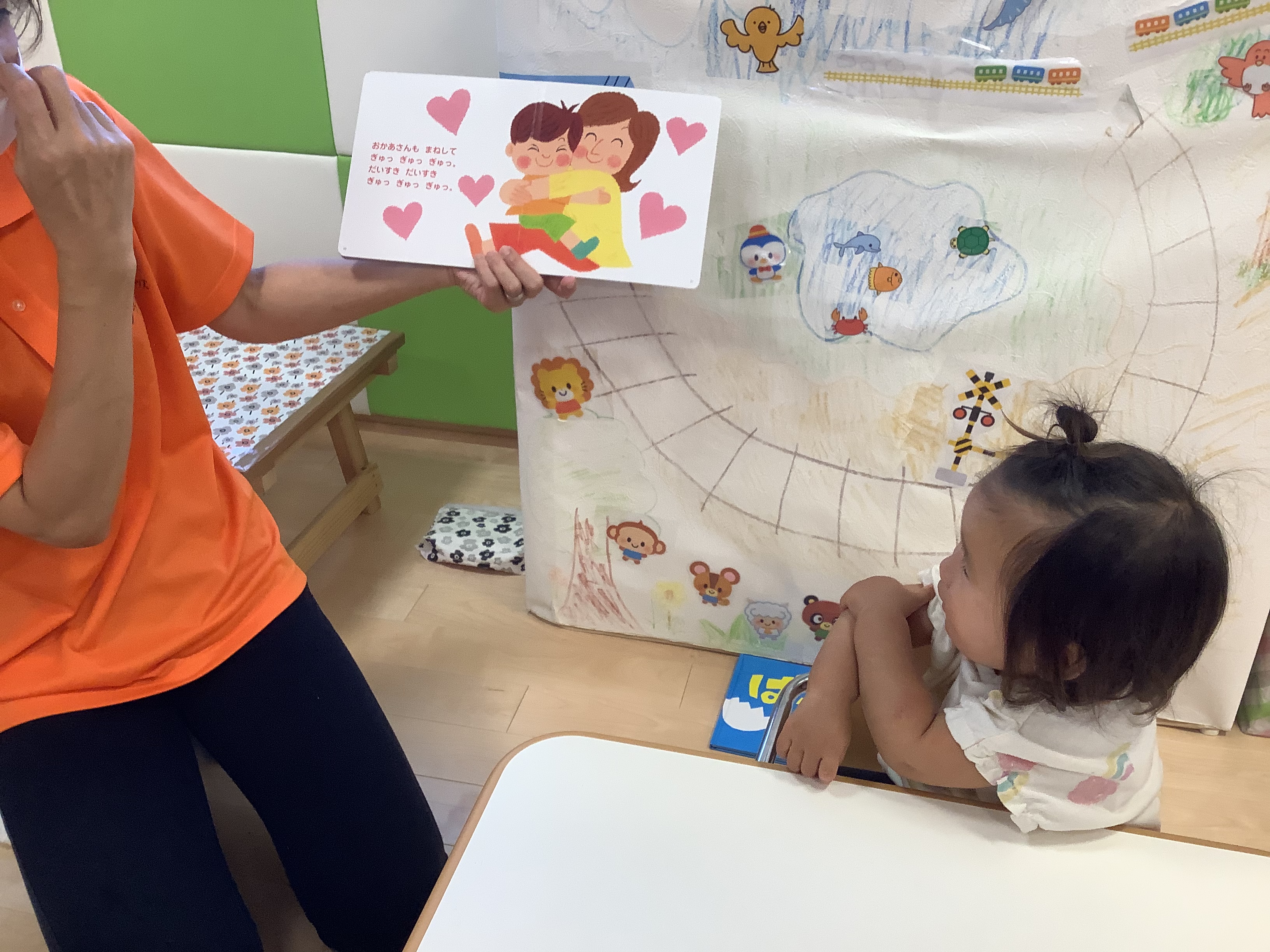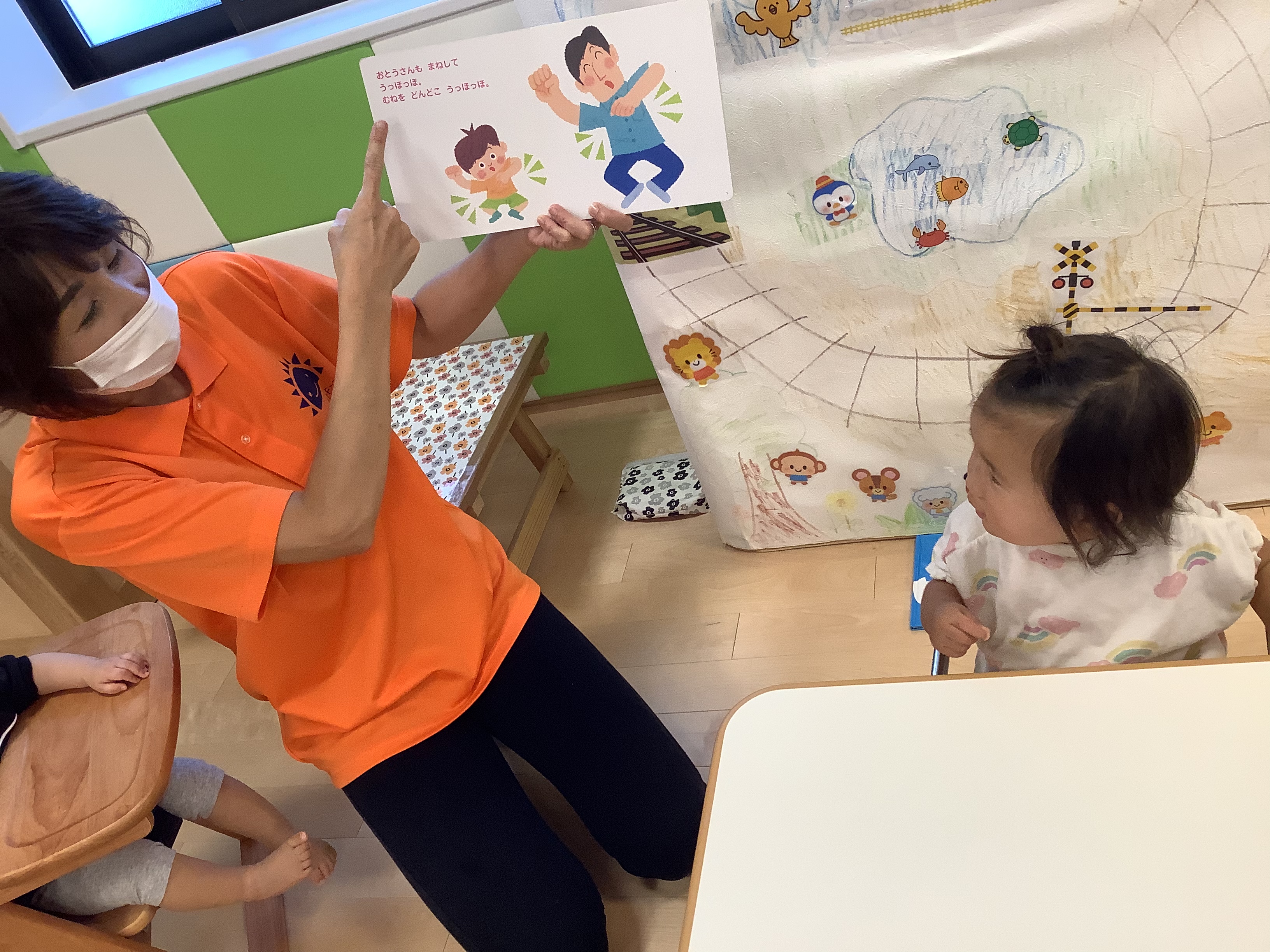 今日は、「まねっこたいそう」という絵本を見ている様子を紹介します?