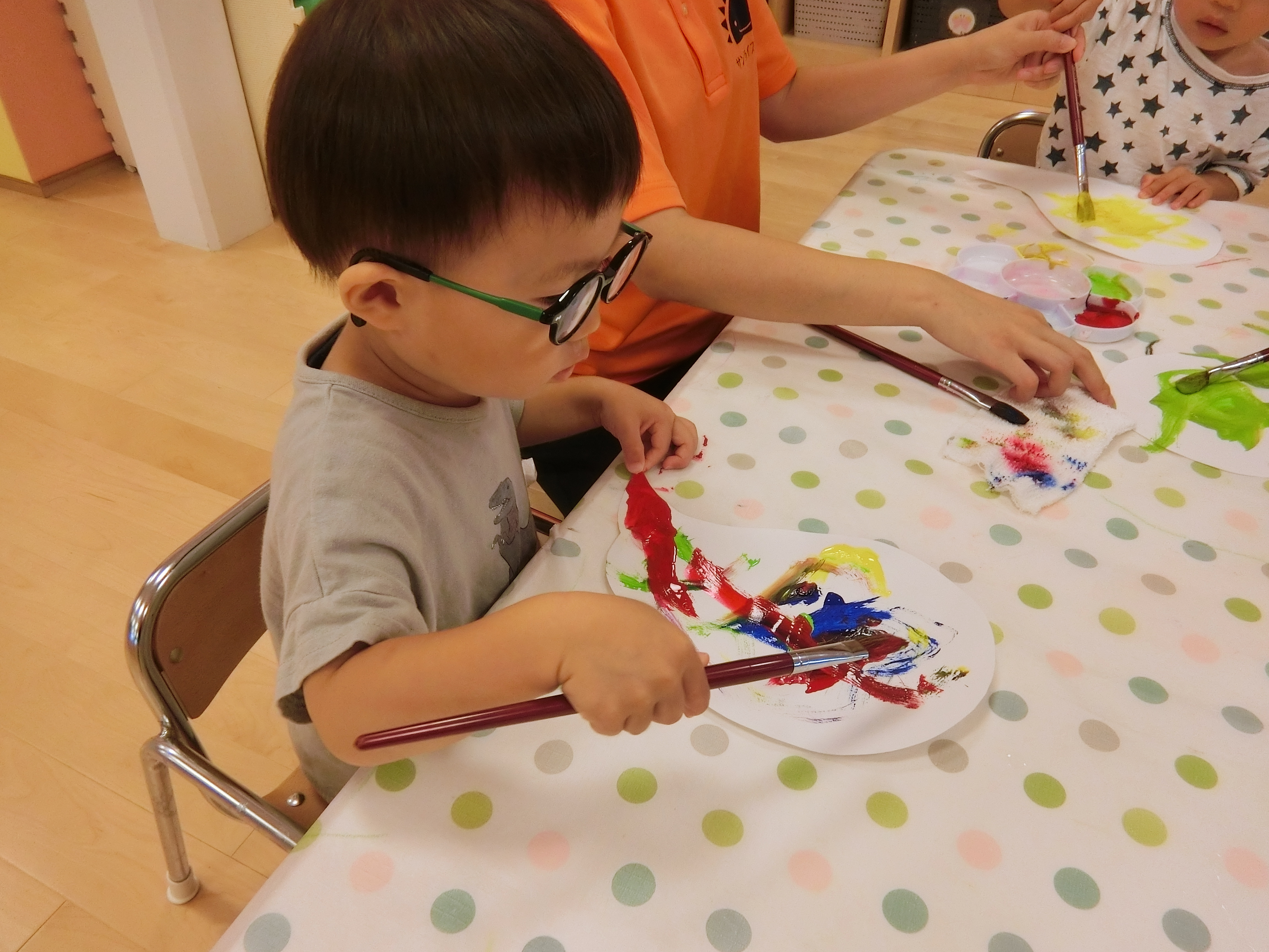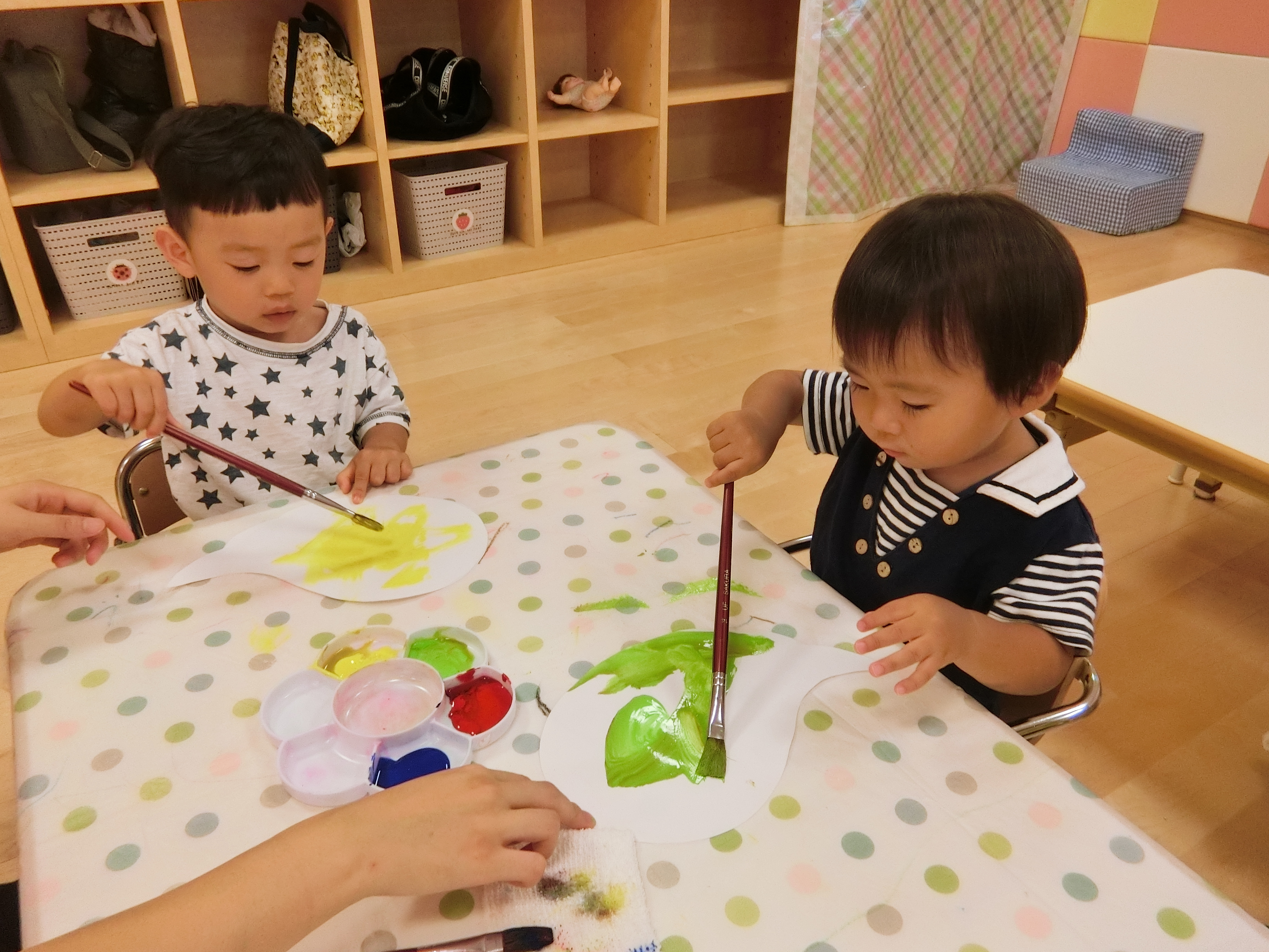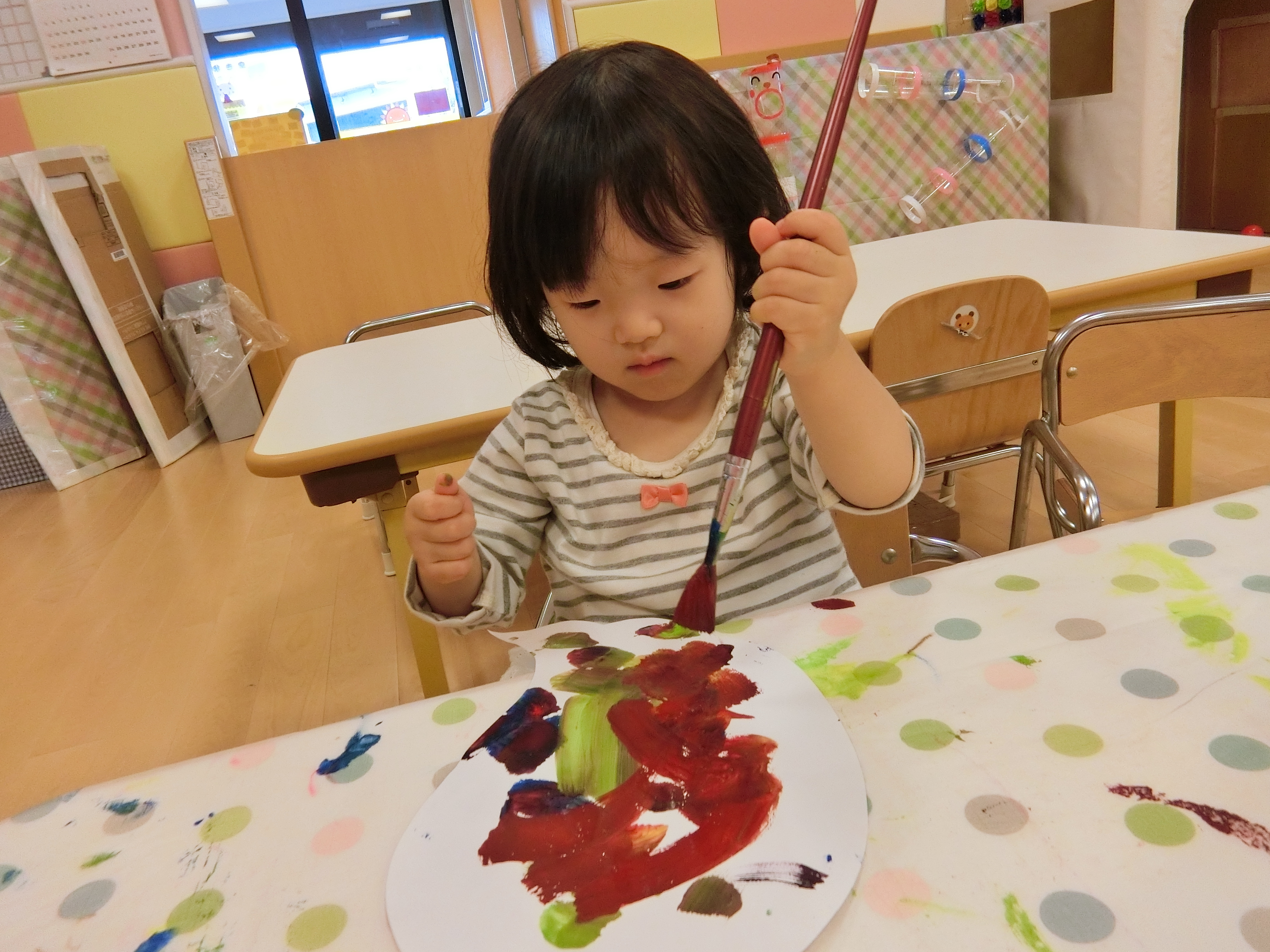 2歳児(りんご組)は、〝信楽たぬきの日〟の【たぬきのカラーリングコンテスト】で展示していただく、「ぽんぽこちゃん陶人形」に自由に色を塗りました♬