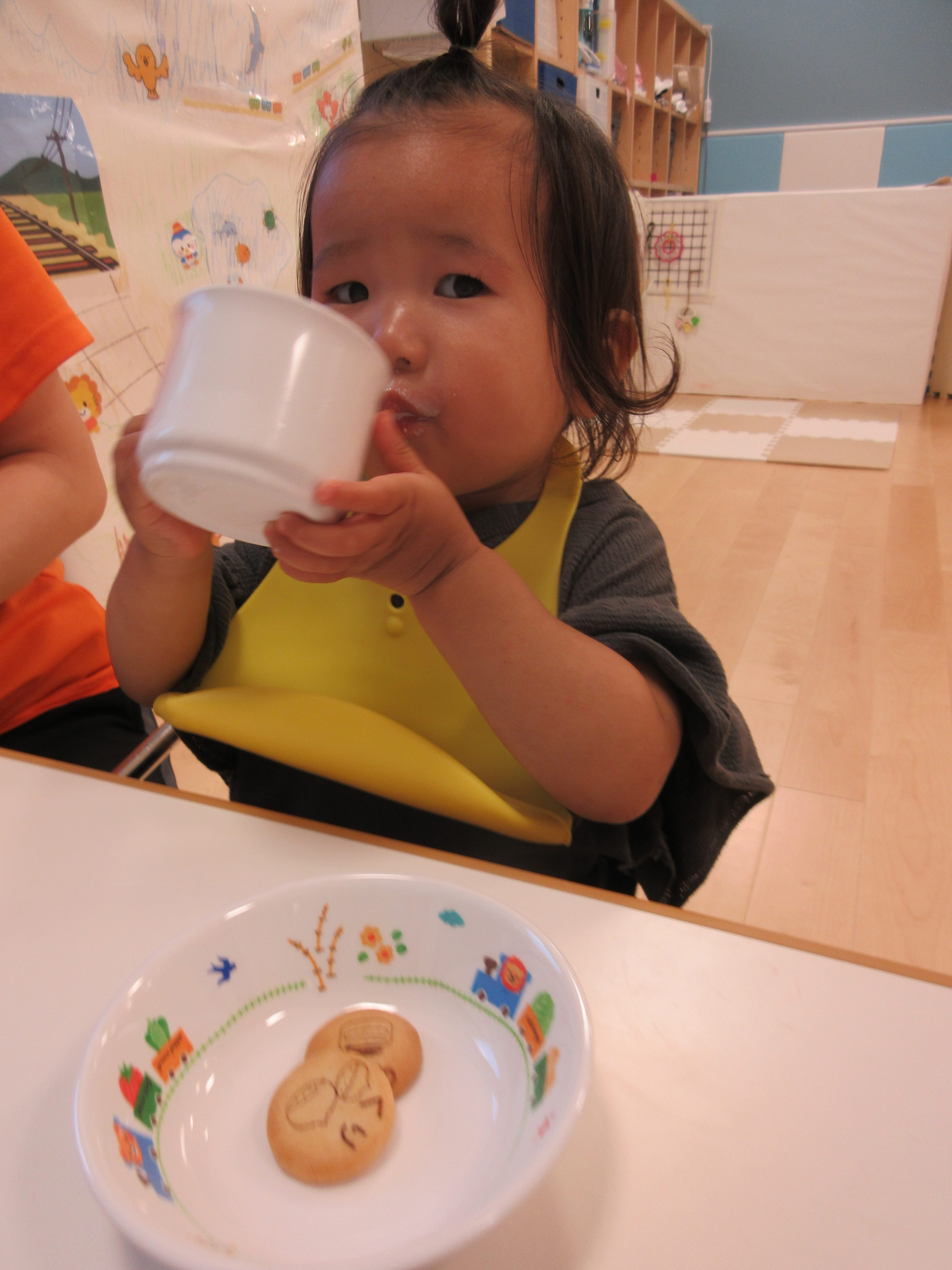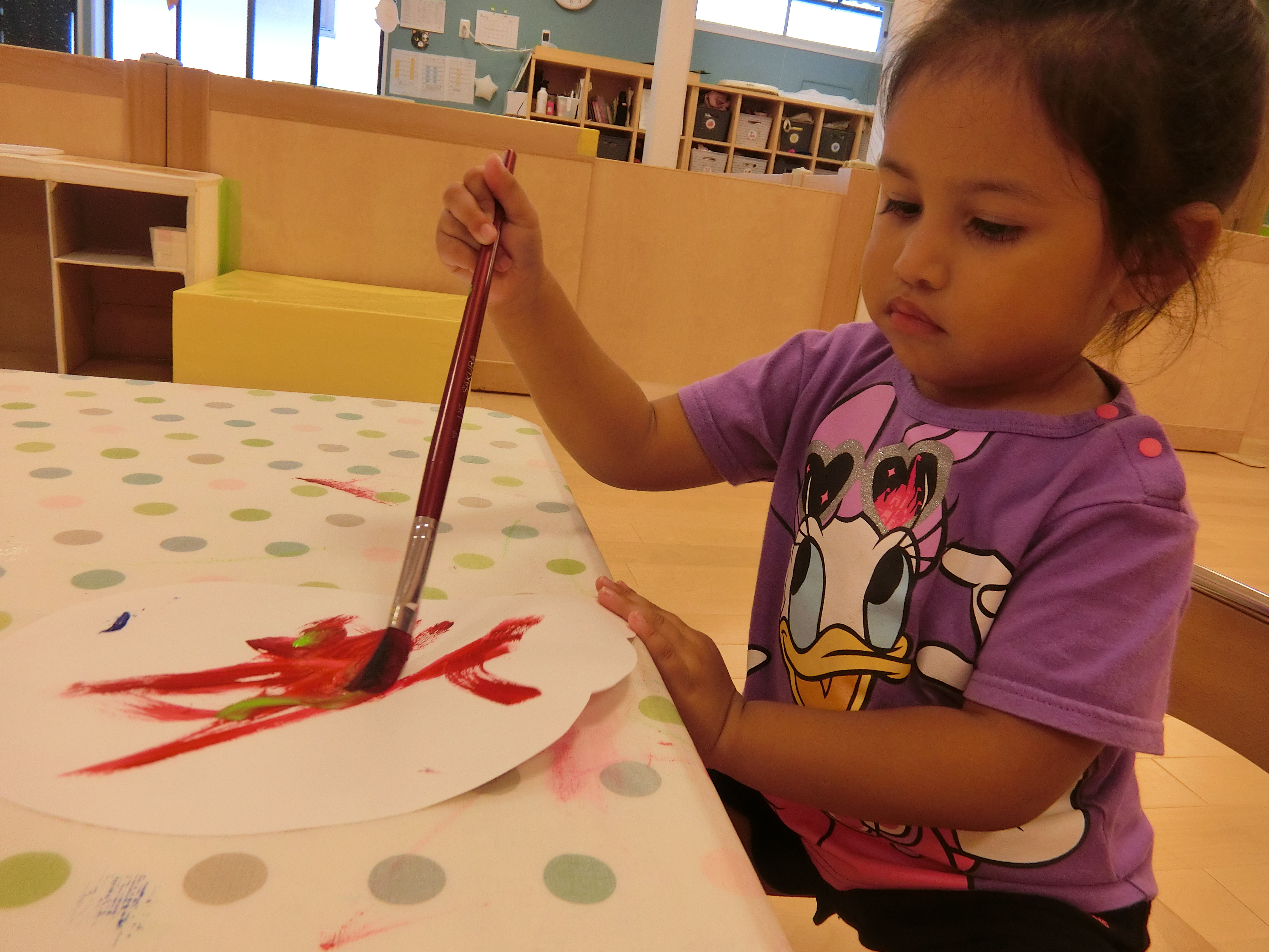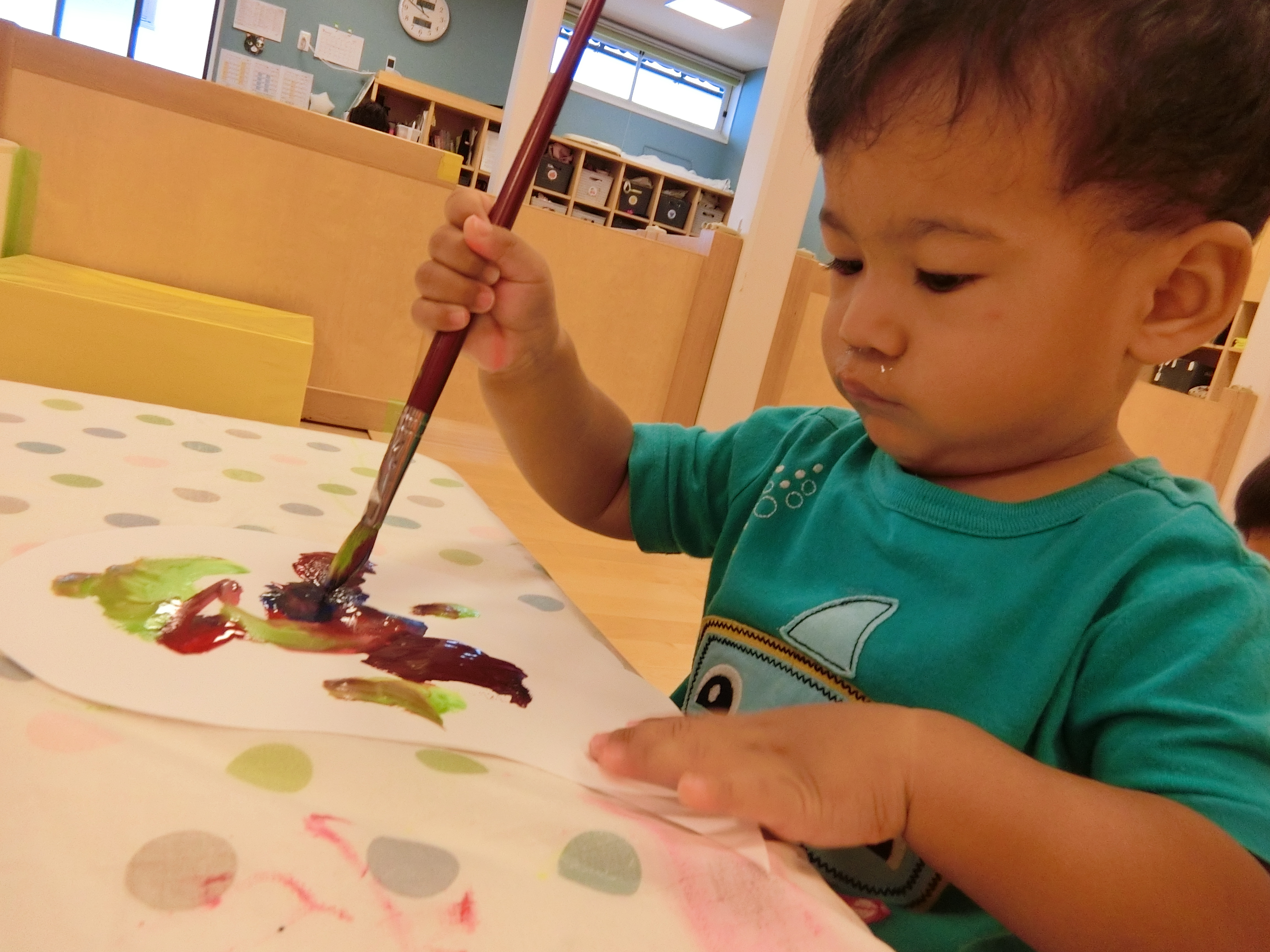 2歳児(りんご組)は、〝信楽たぬきの日〟の【たぬきのカラーリングコンテスト】で展示していただく、「ぽんぽこちゃん陶人形」に自由に色を塗りました♬