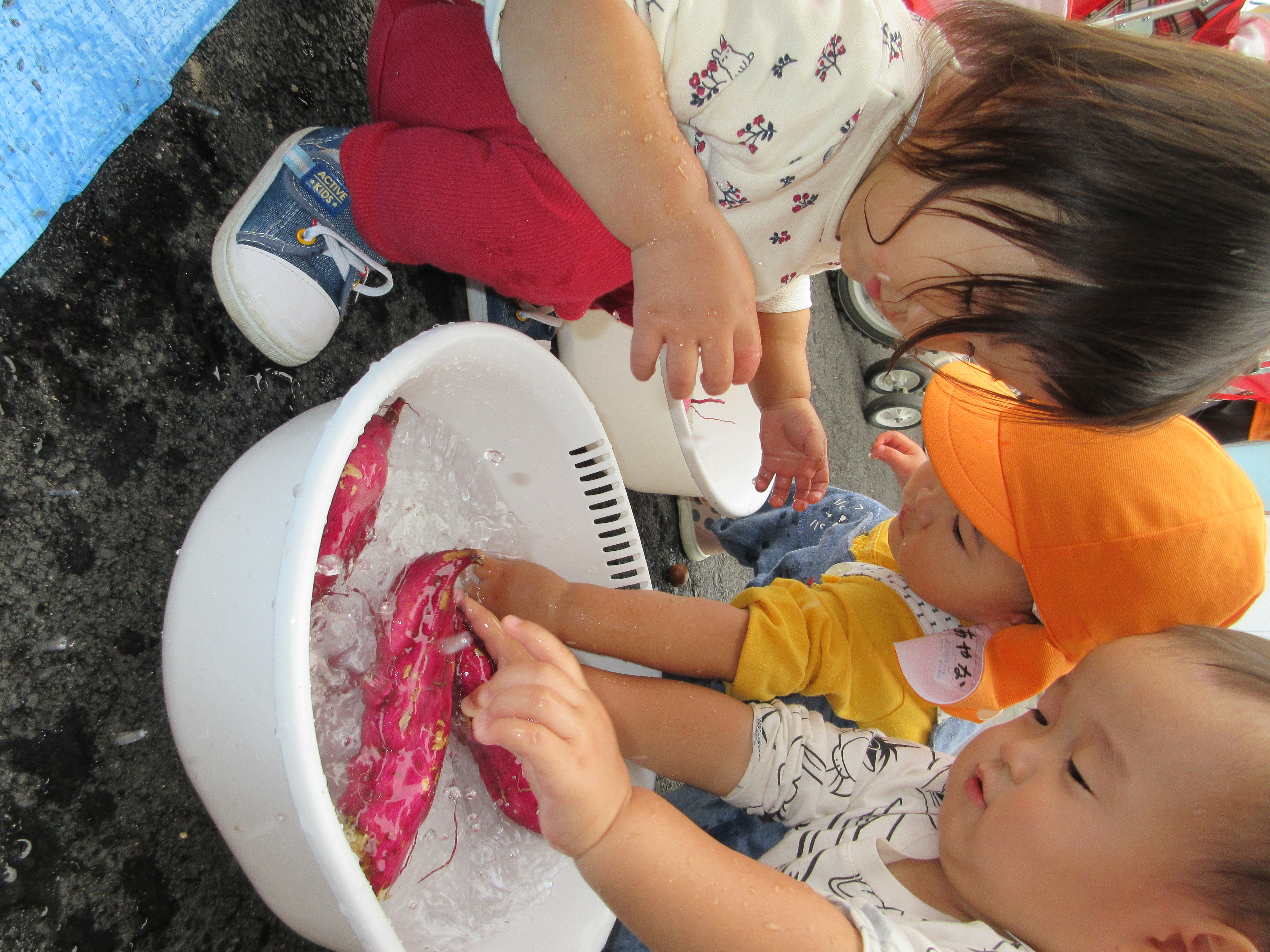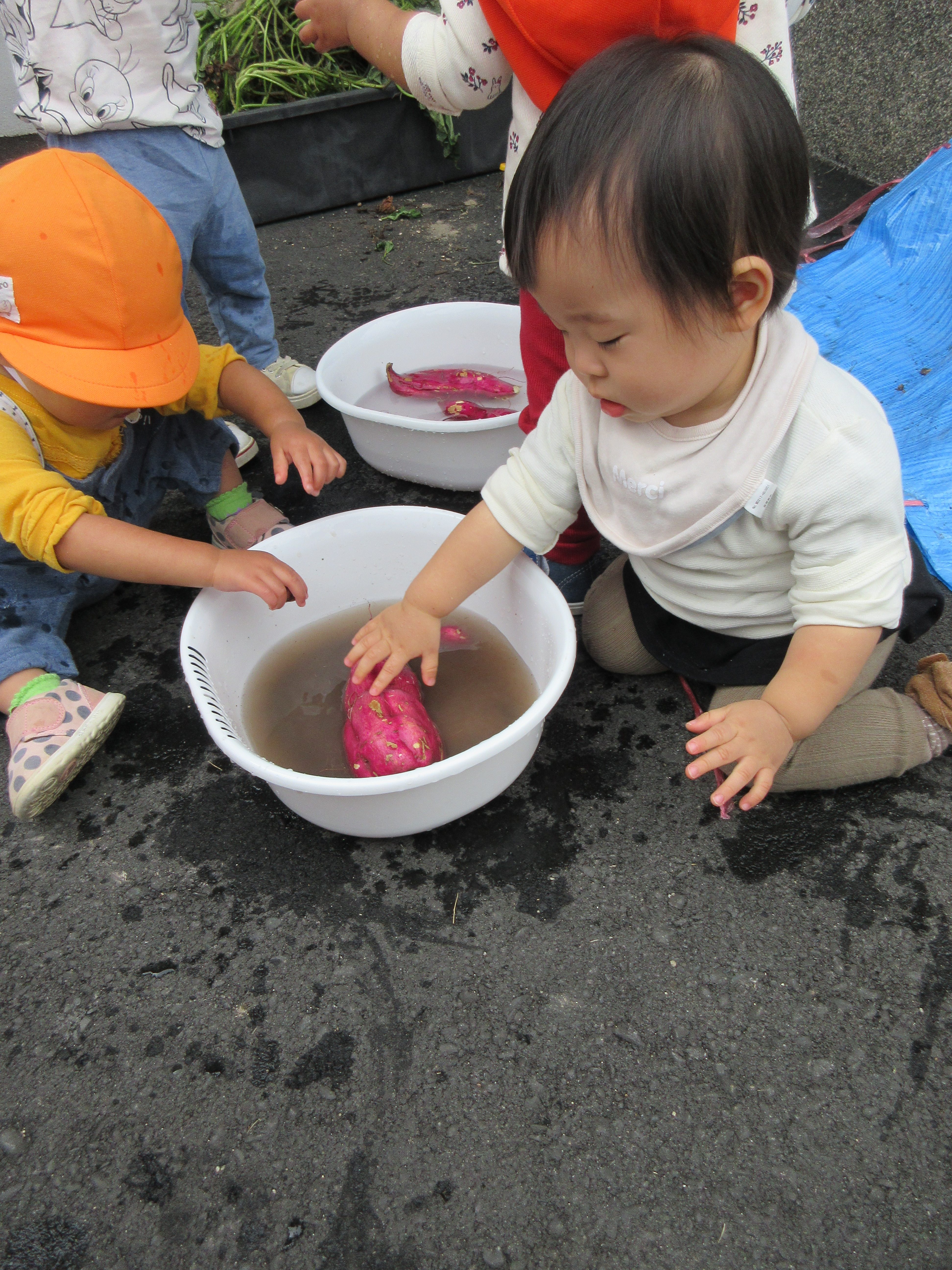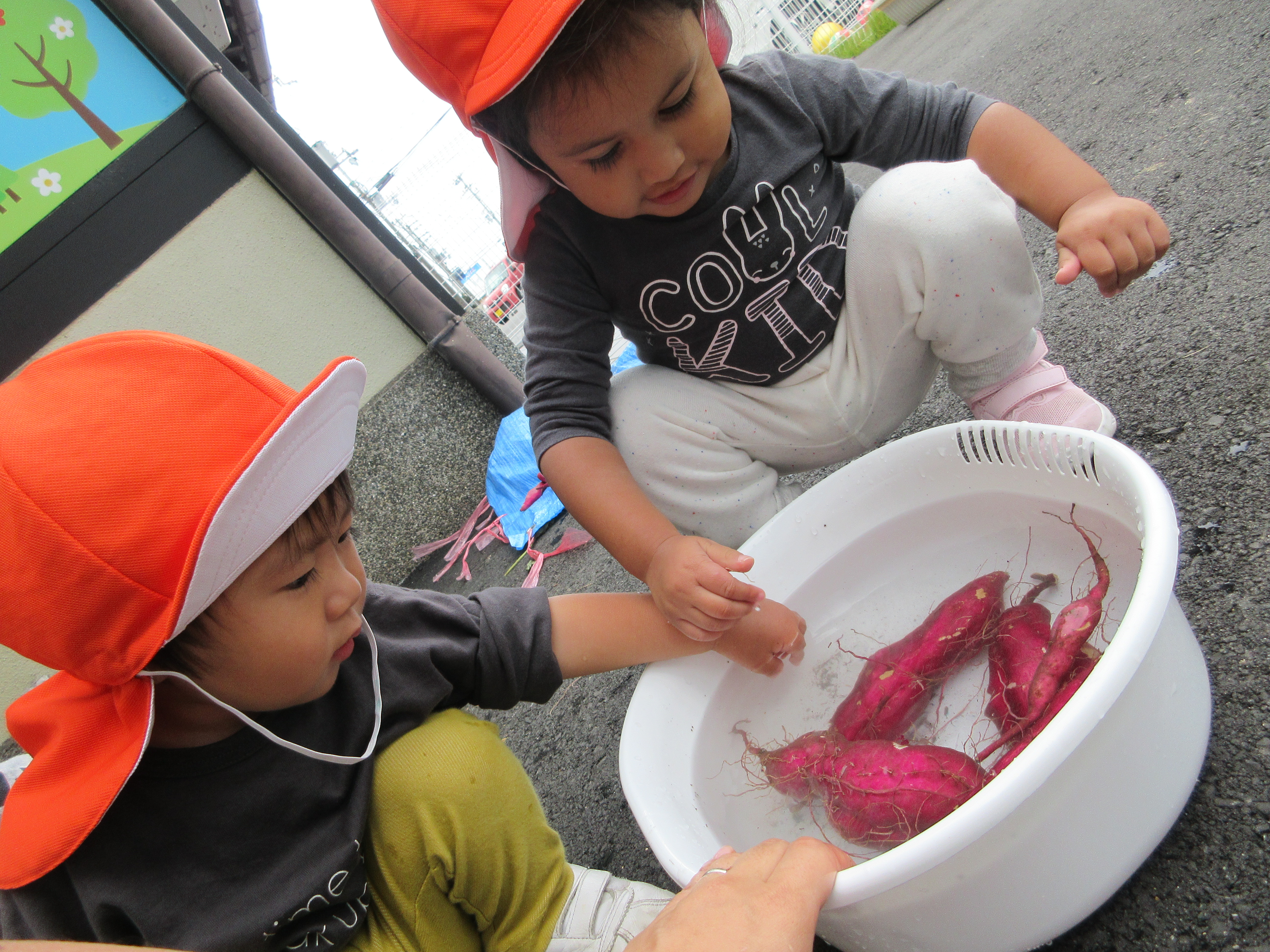 園に寄付していただいた〝さつまいも〟で、今週は月曜日に〝さつまいも掘り〟の体験をし、火曜日に〝さつまいも〟を洗って、おやつにいただきました♬