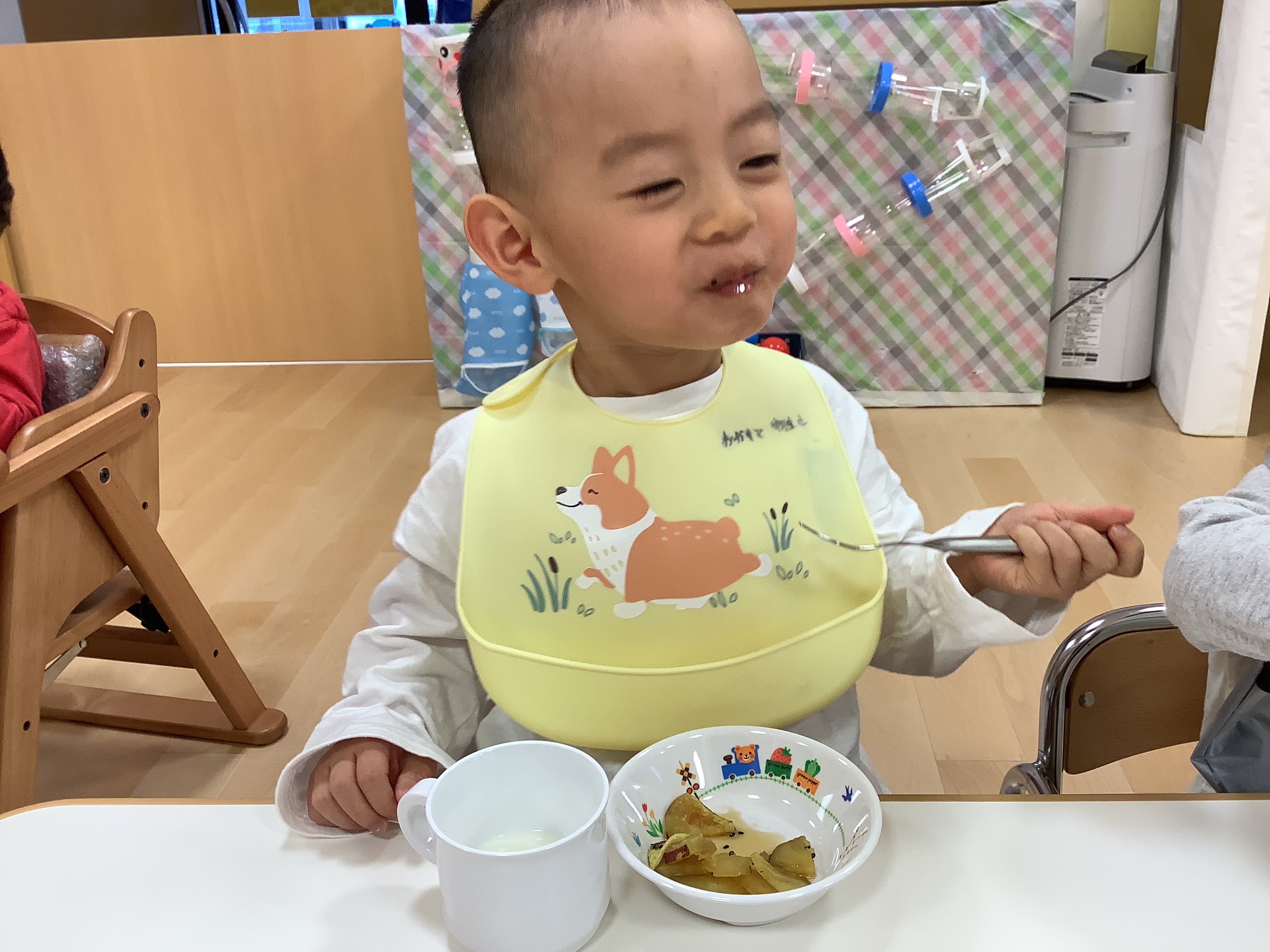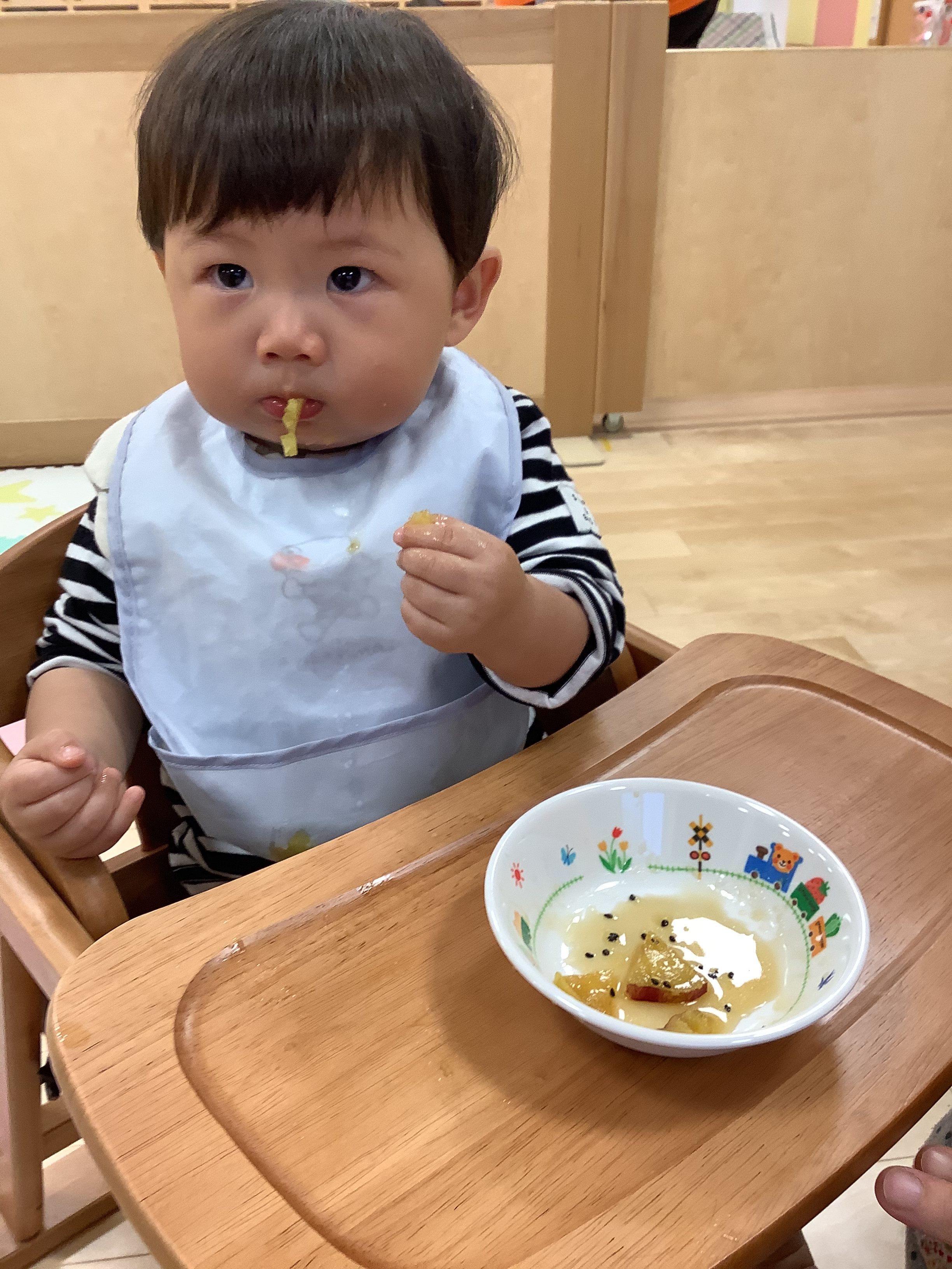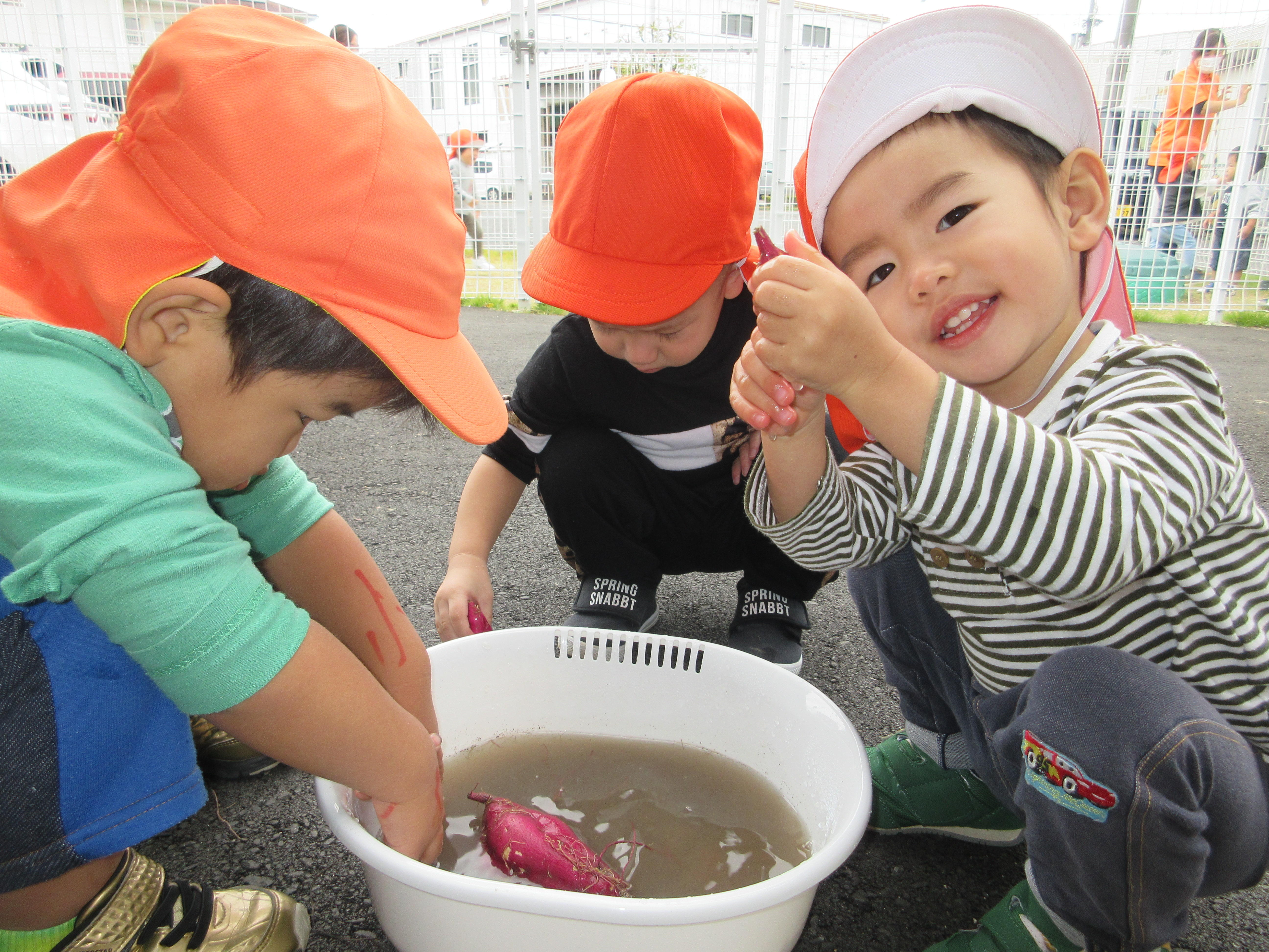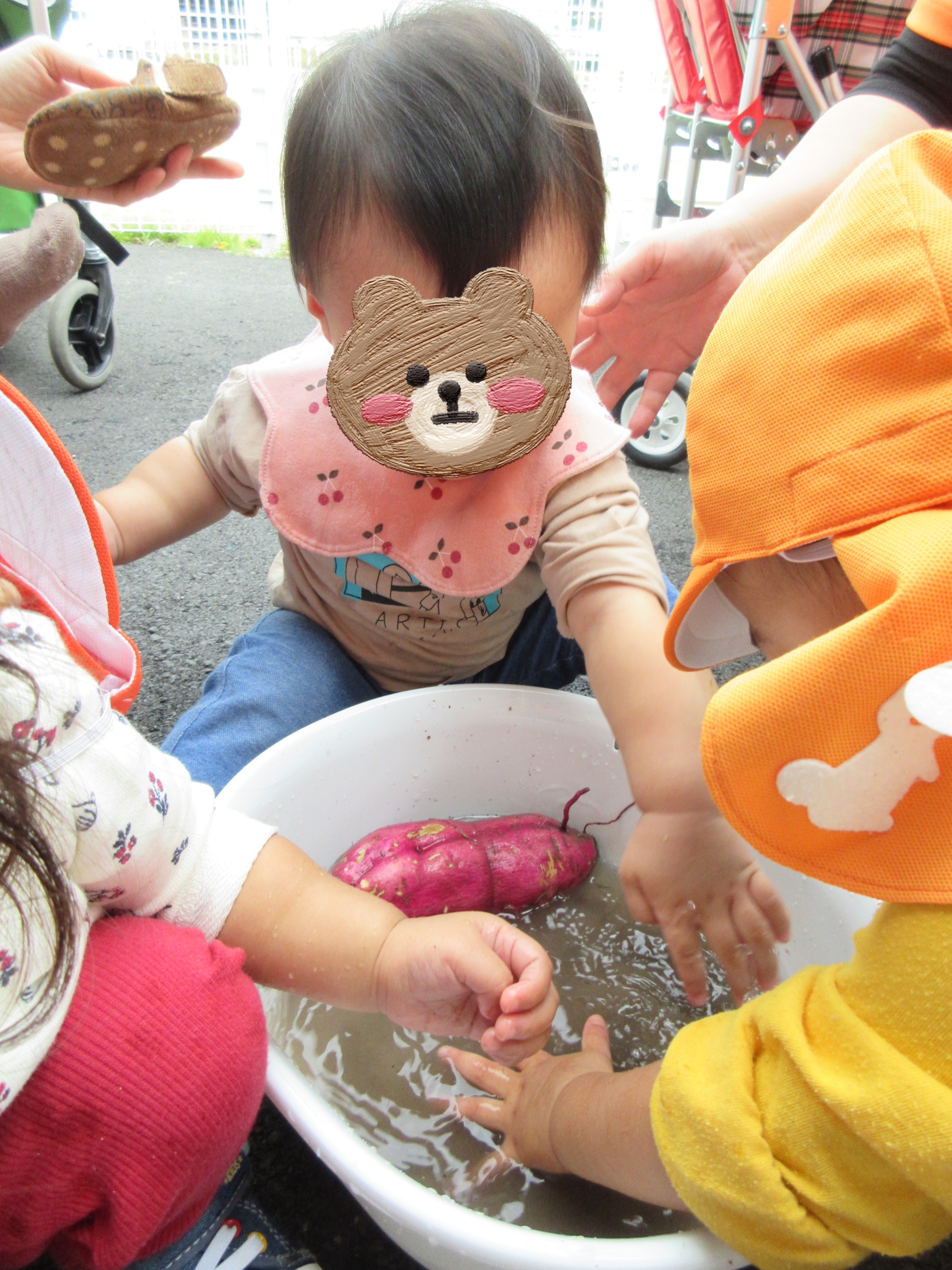園に寄付していただいた〝さつまいも〟で、今週は月曜日に〝さつまいも掘り〟の体験をし、火曜日に〝さつまいも〟を洗って、おやつにいただきました♬