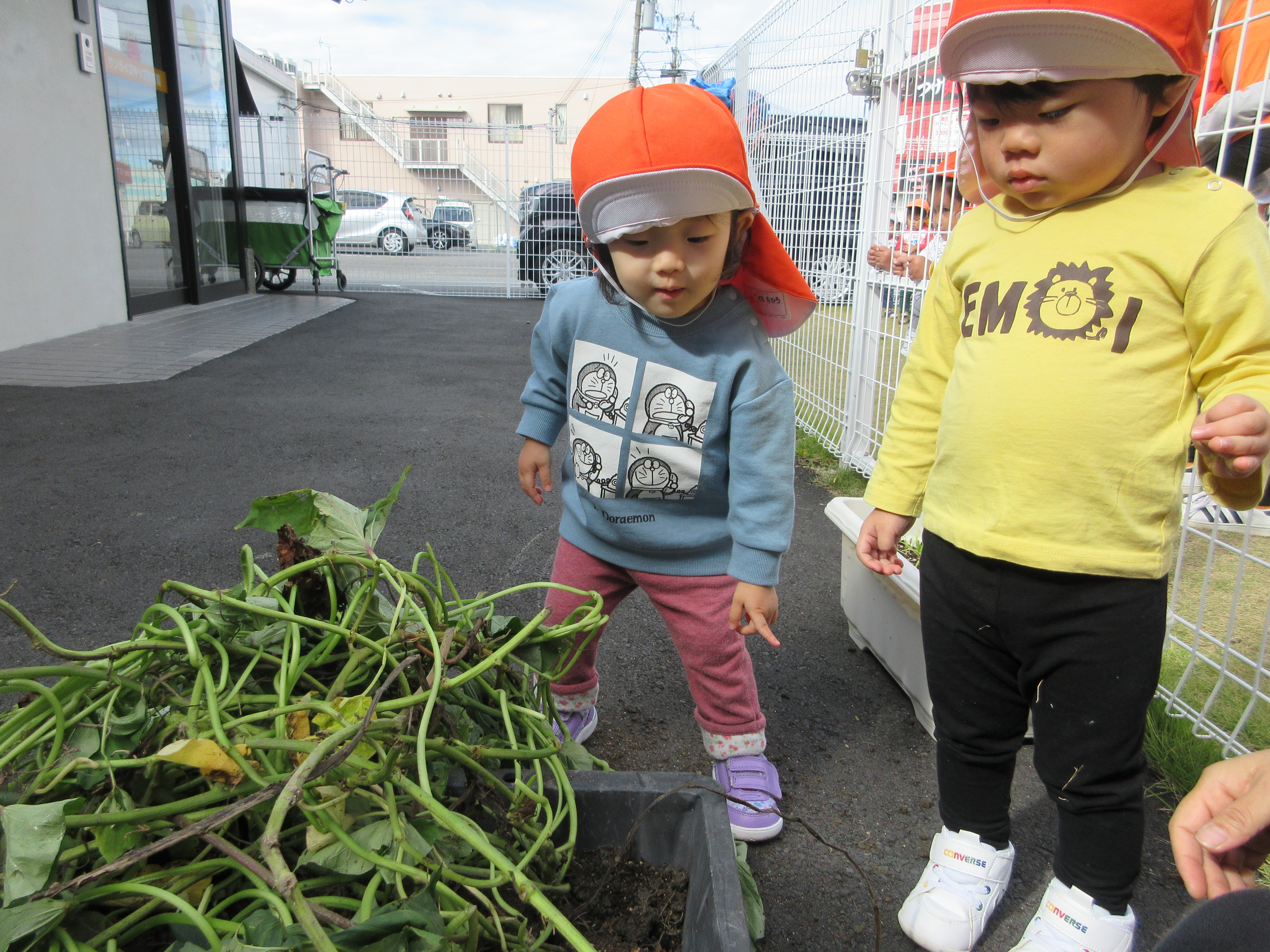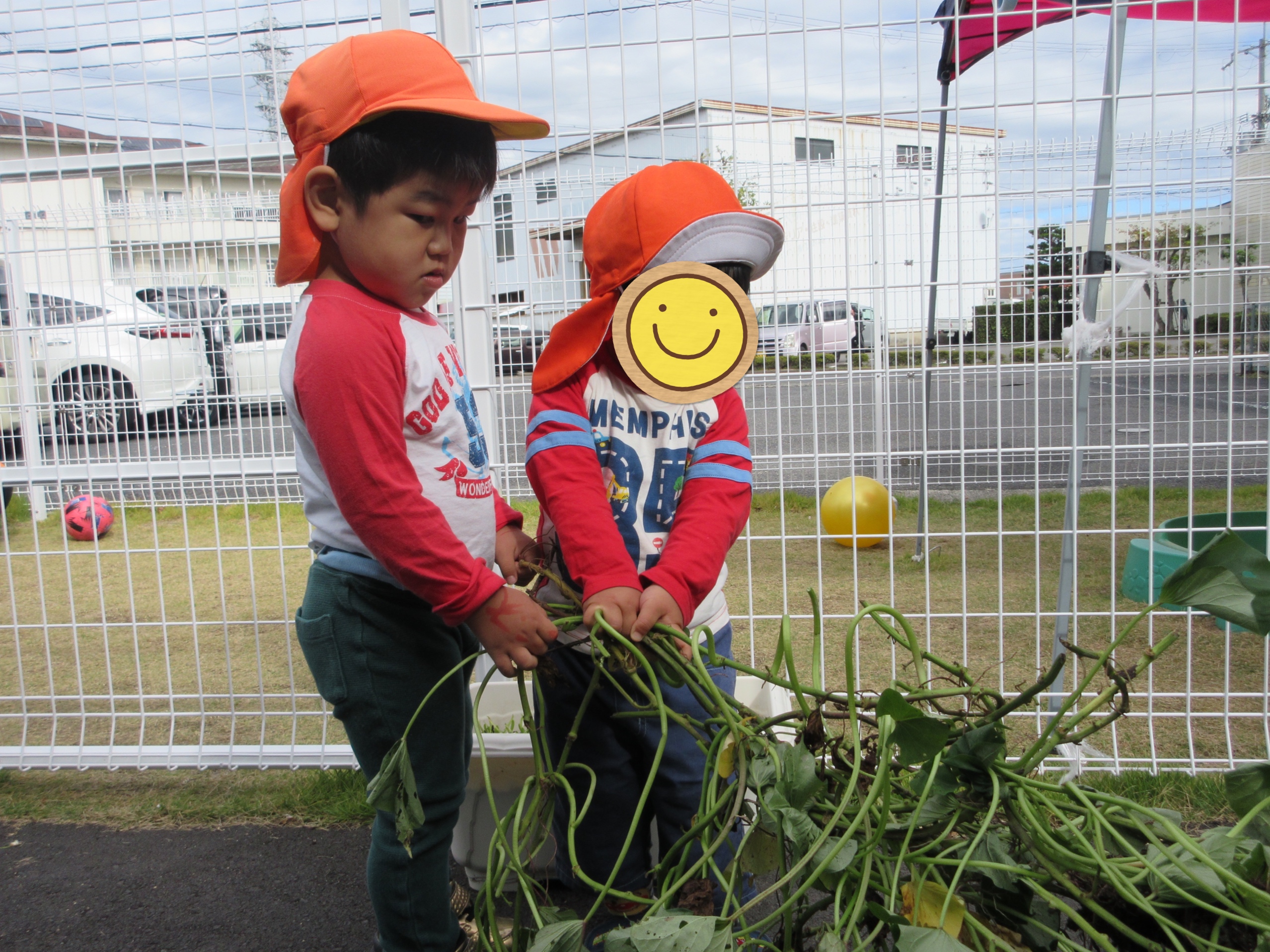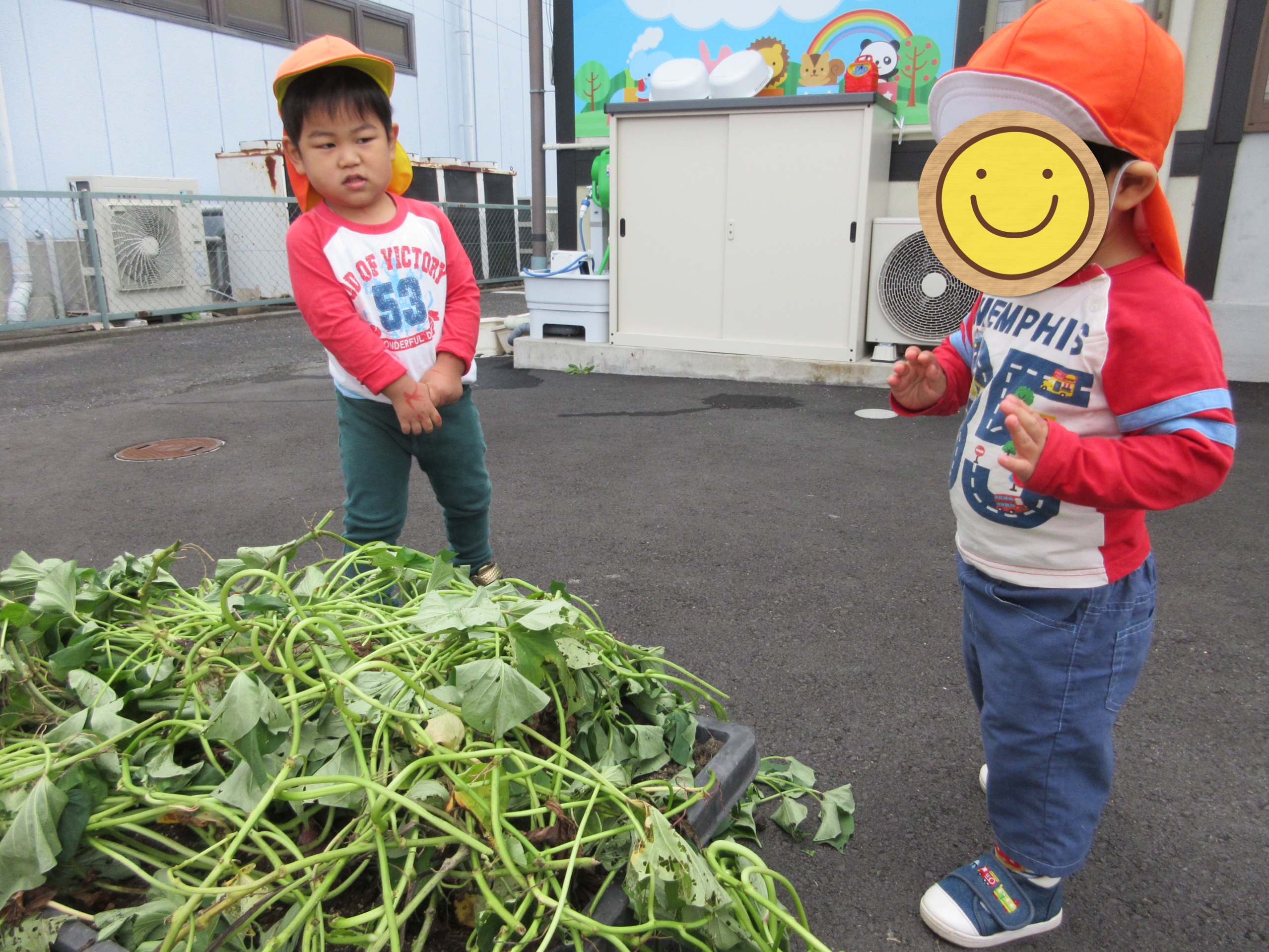 〝よいしょ よいしょ おきろよ おきろ♬〟(絵本「おいもさんがね…」?)のセリフをマネて「うんとこしょ どっこいしょ‼️」と〝さつまいも〟のツルをひっぱりました(о´∀`о)
