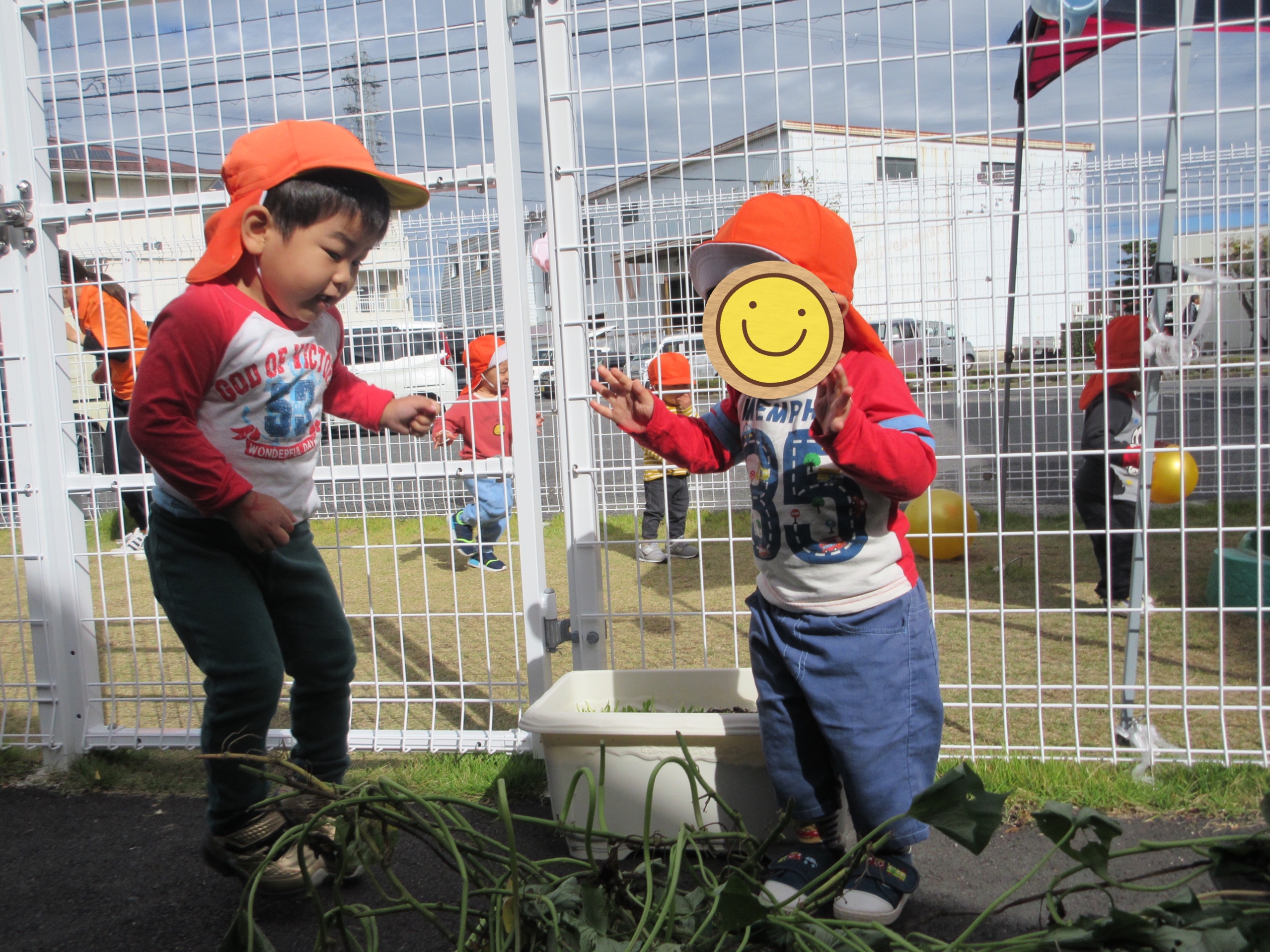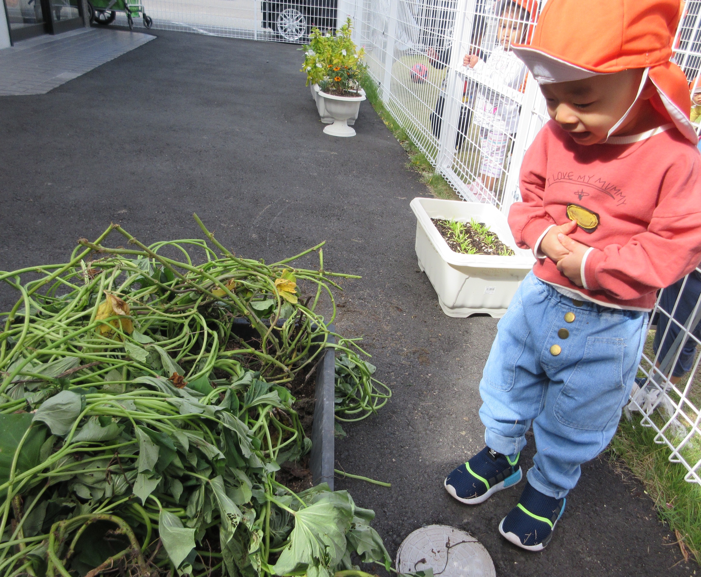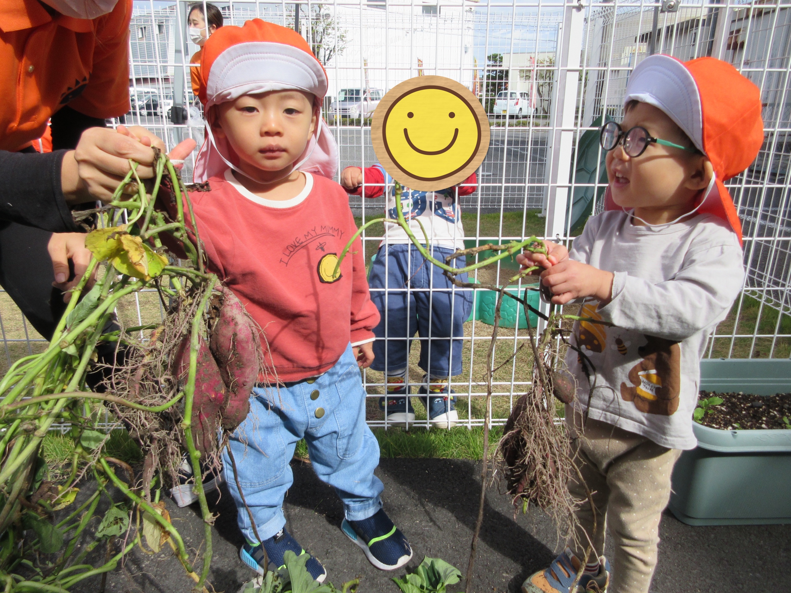 〝よいしょ よいしょ おきろよ おきろ♬〟(絵本「おいもさんがね…」?)のセリフをマネて「うんとこしょ どっこいしょ‼️」と〝さつまいも〟のツルをひっぱりました(о´∀`о)