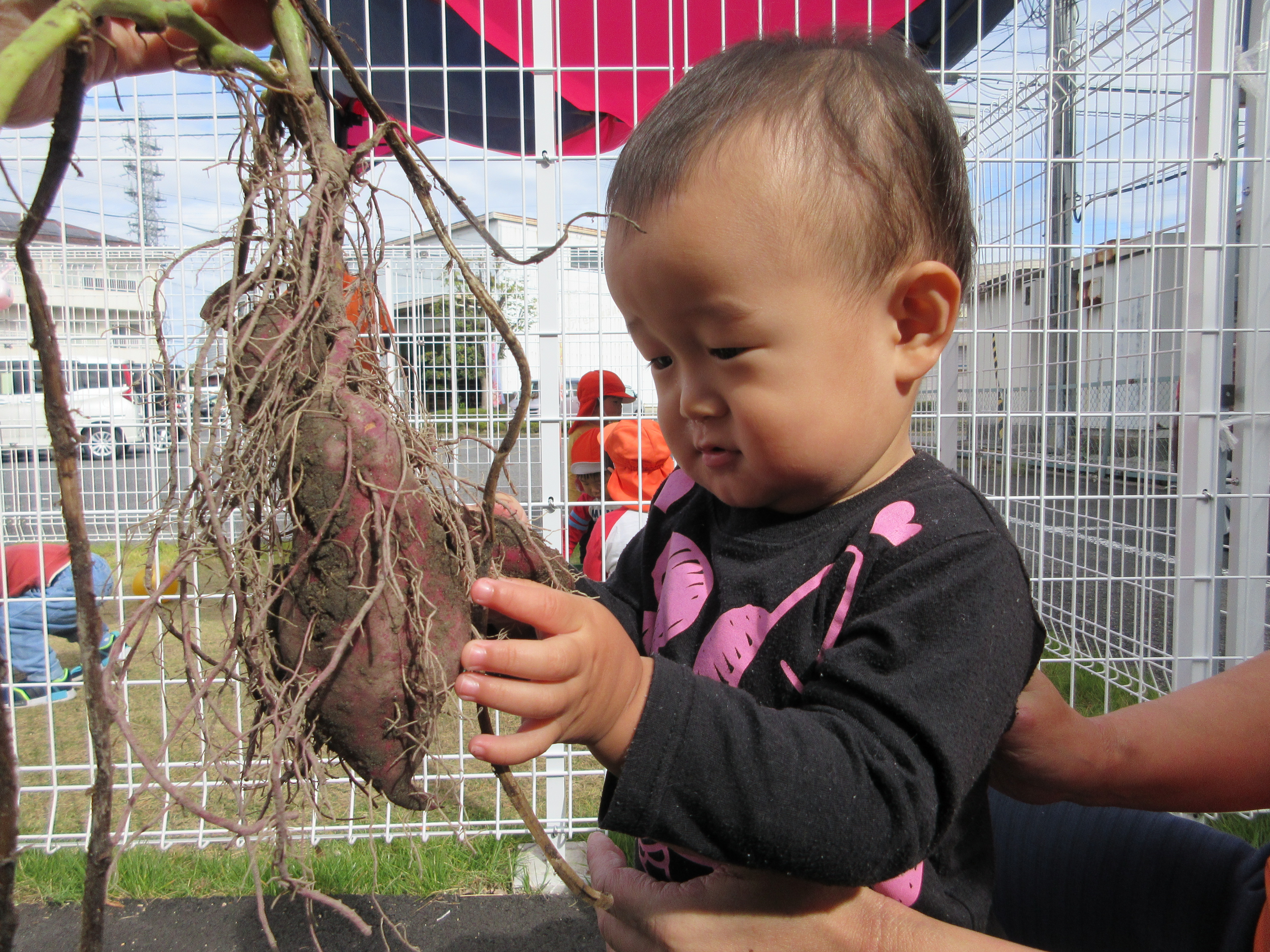 土の中から顔を出したサツマイモをみつけ、嬉しそう♡