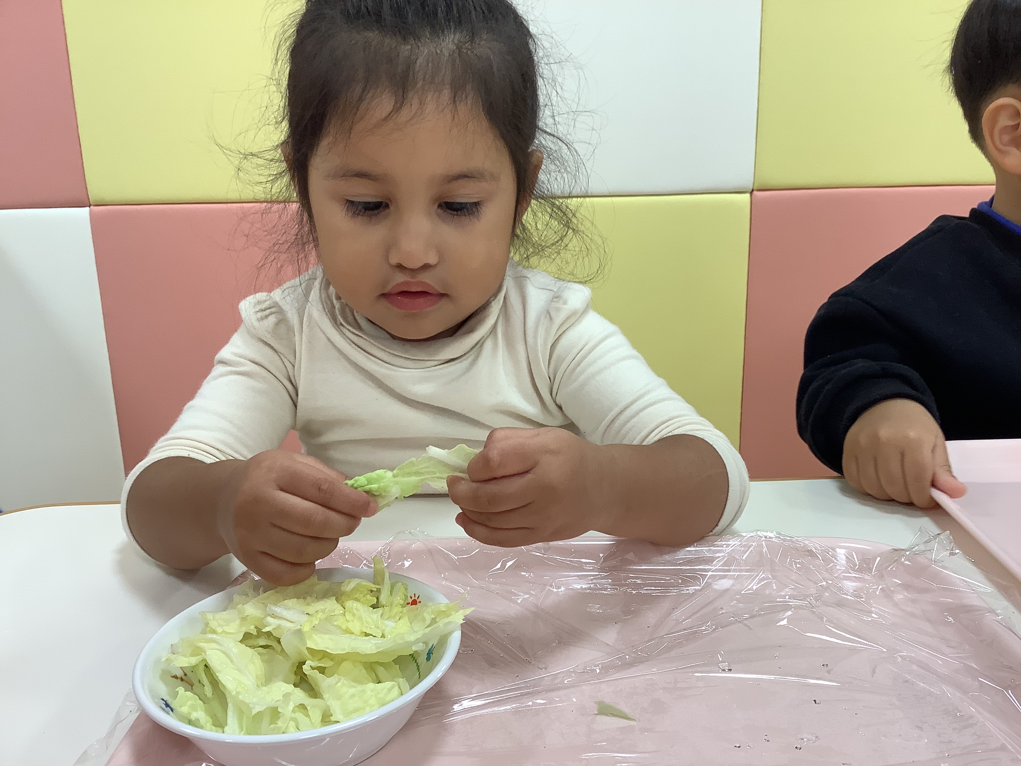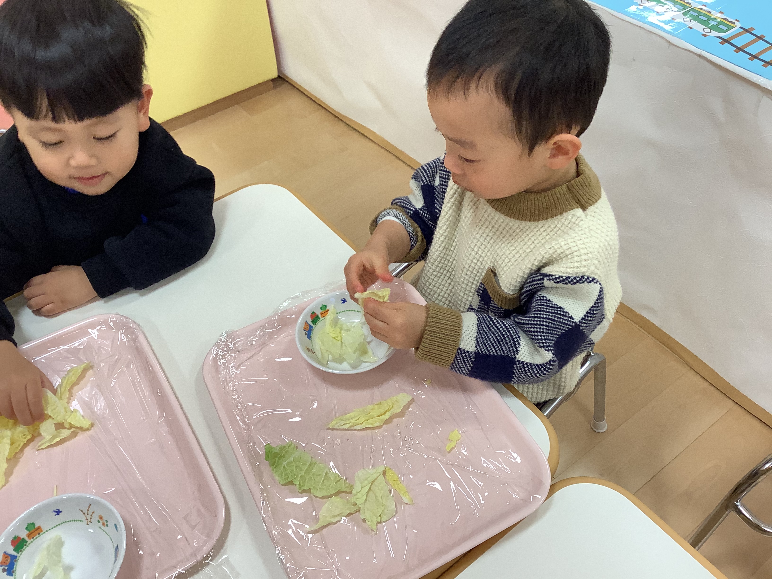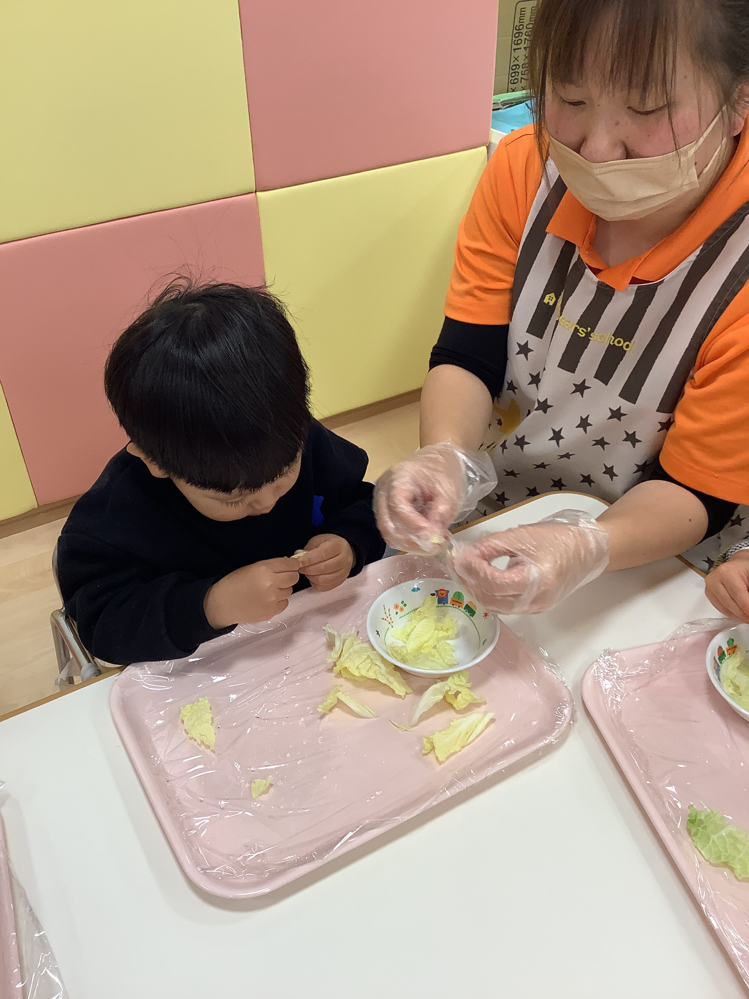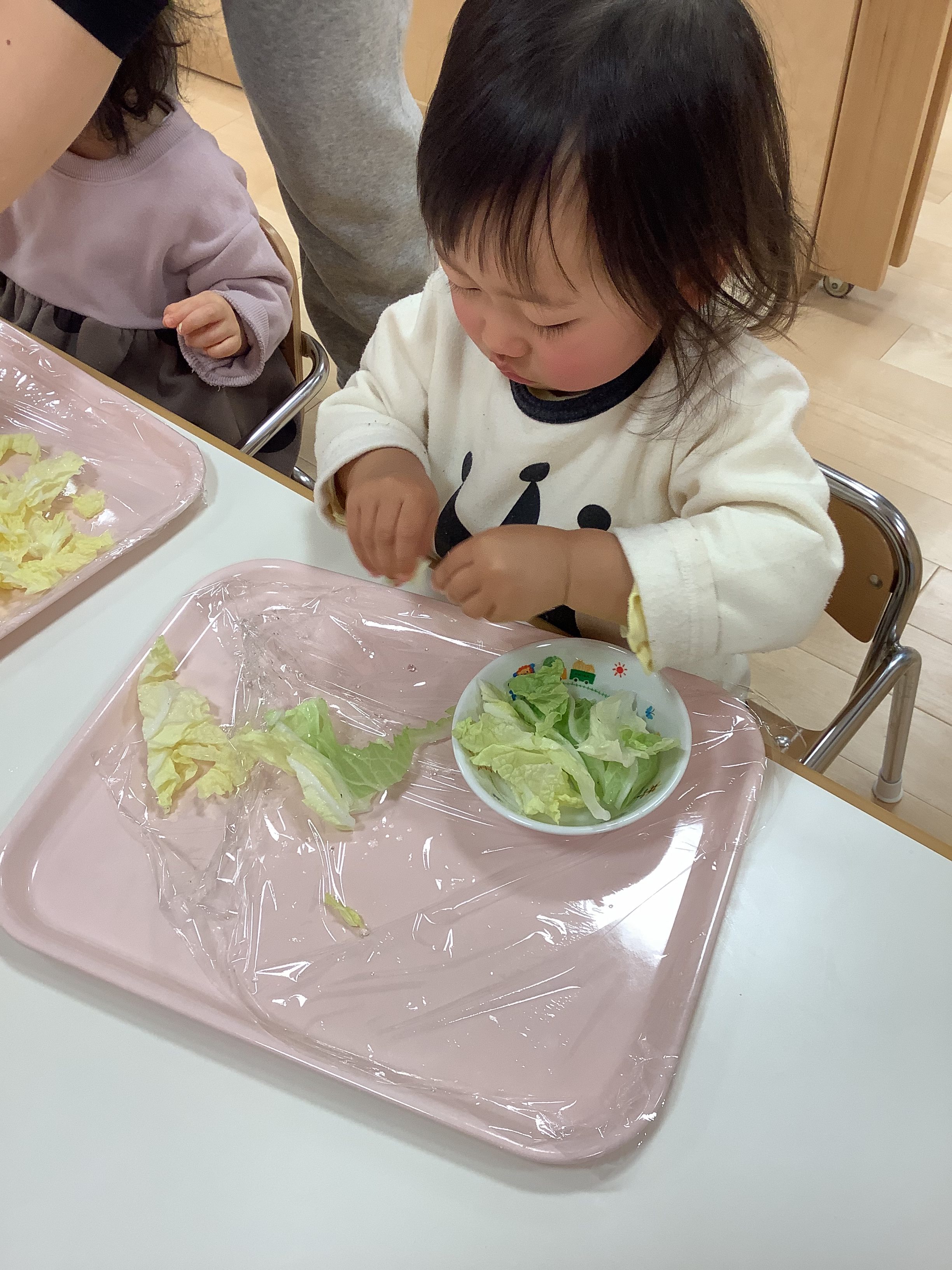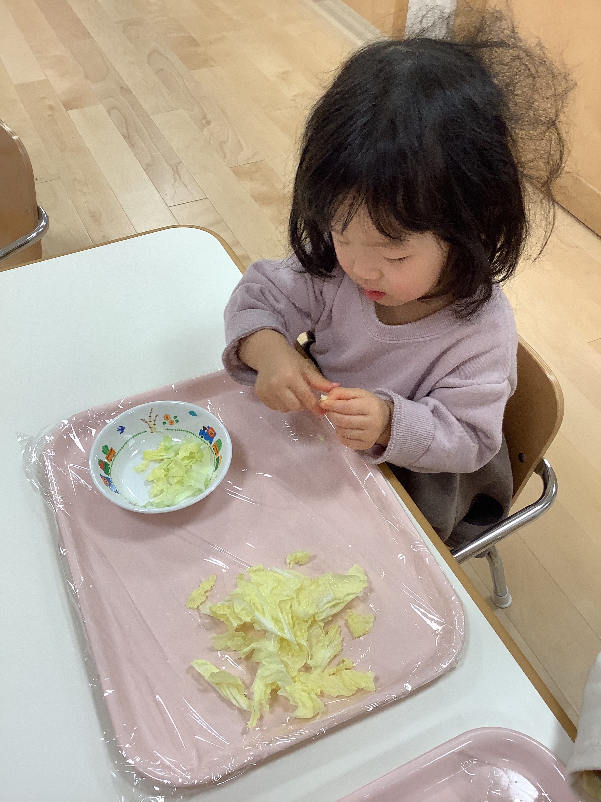 そして、今週は食育の一環で、給食の〝白菜の味噌汁〟に使う〝白菜〟を、ちぎりました(*’▽’*)