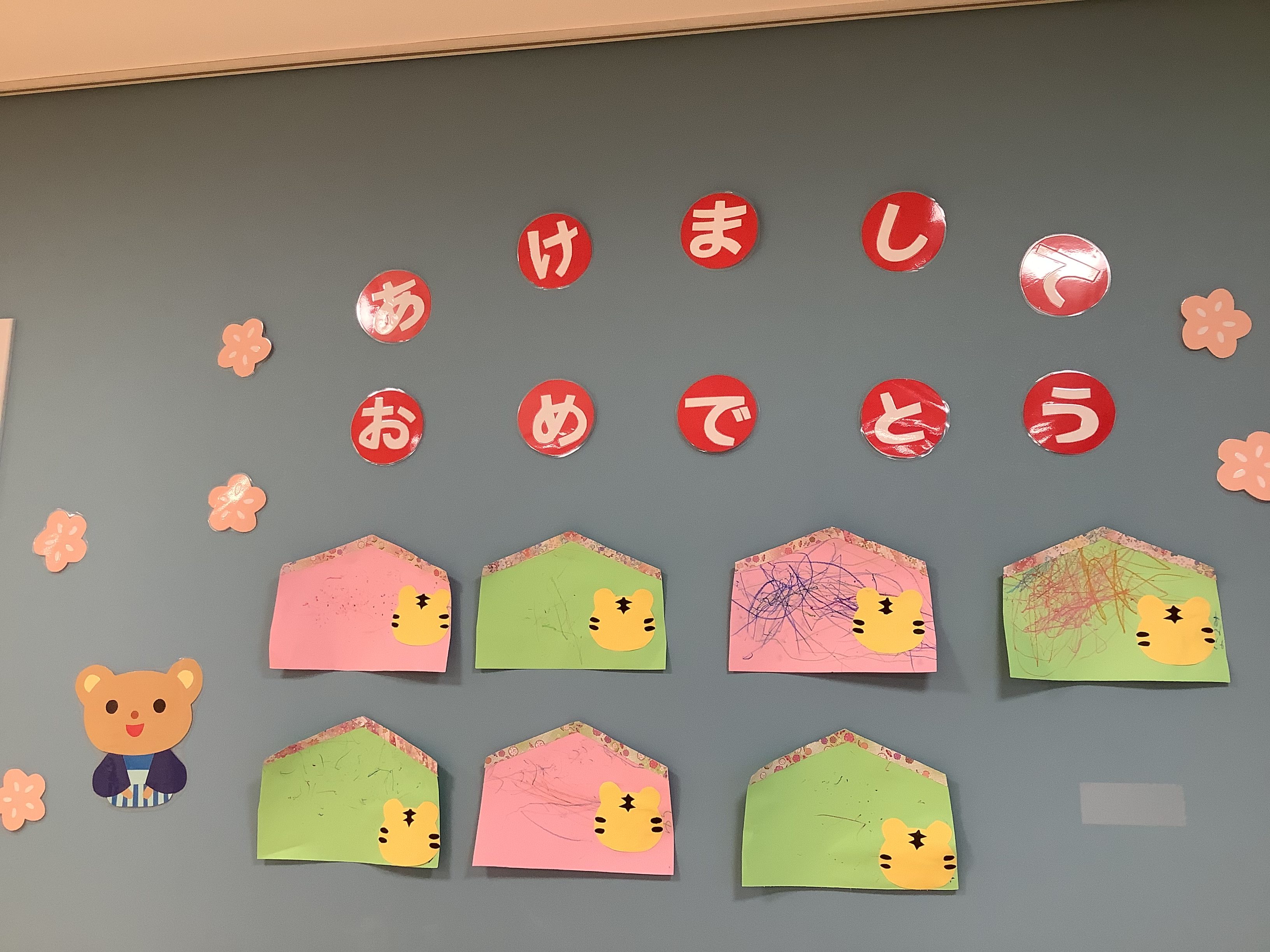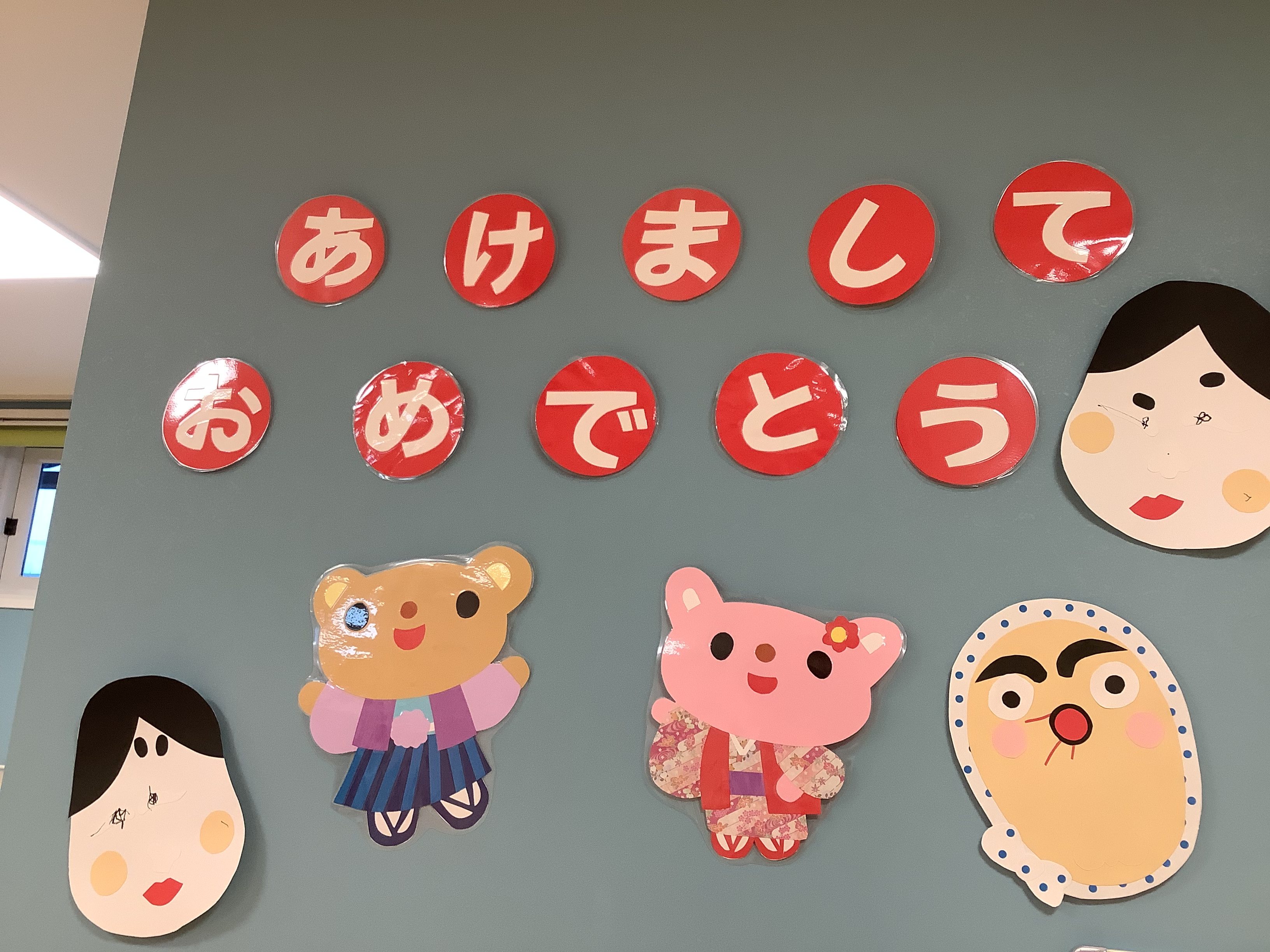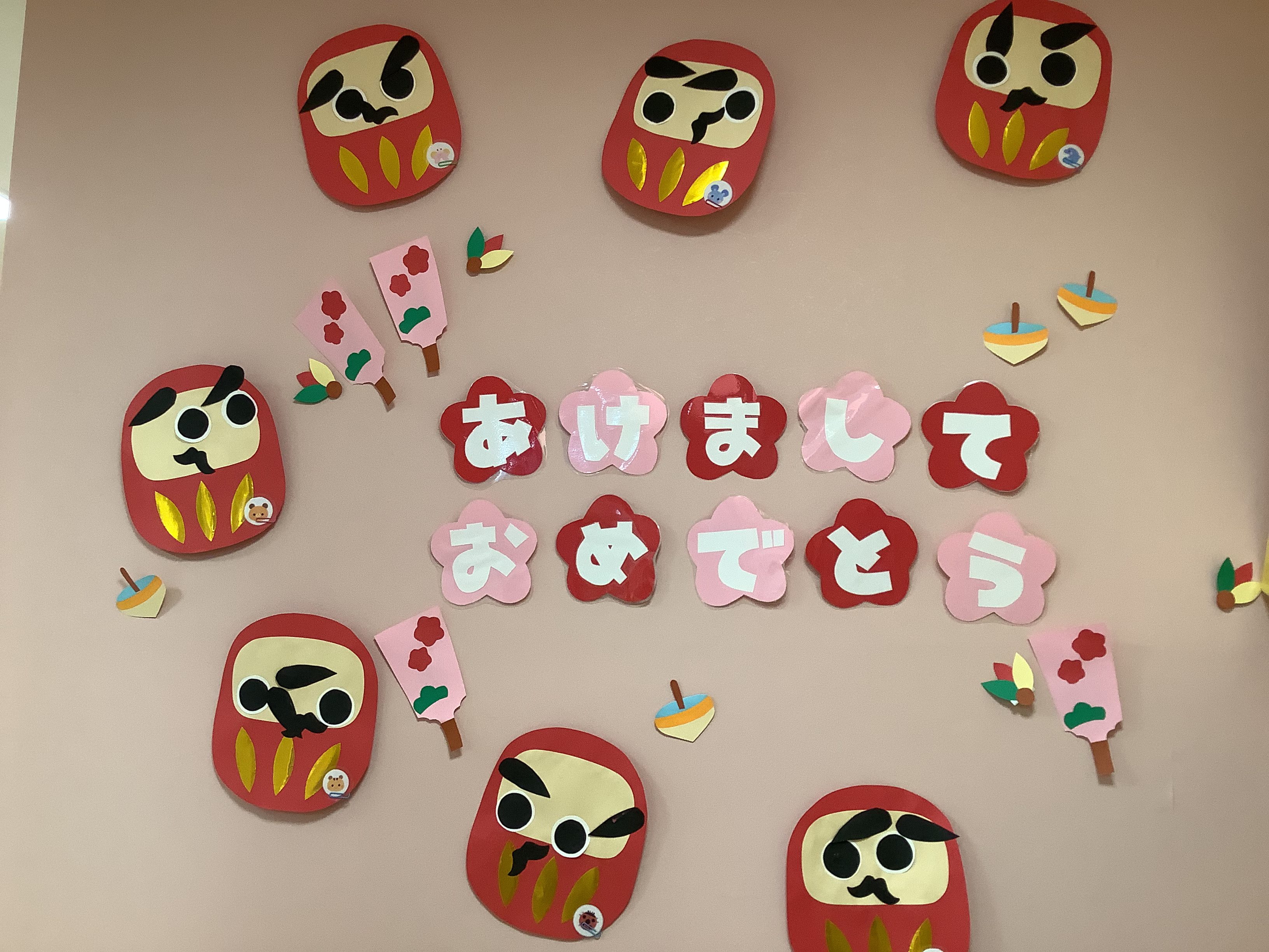 新年を迎え、室内には、子どもたちの手を加えた可愛い〝正月の壁面〟を飾っています✨