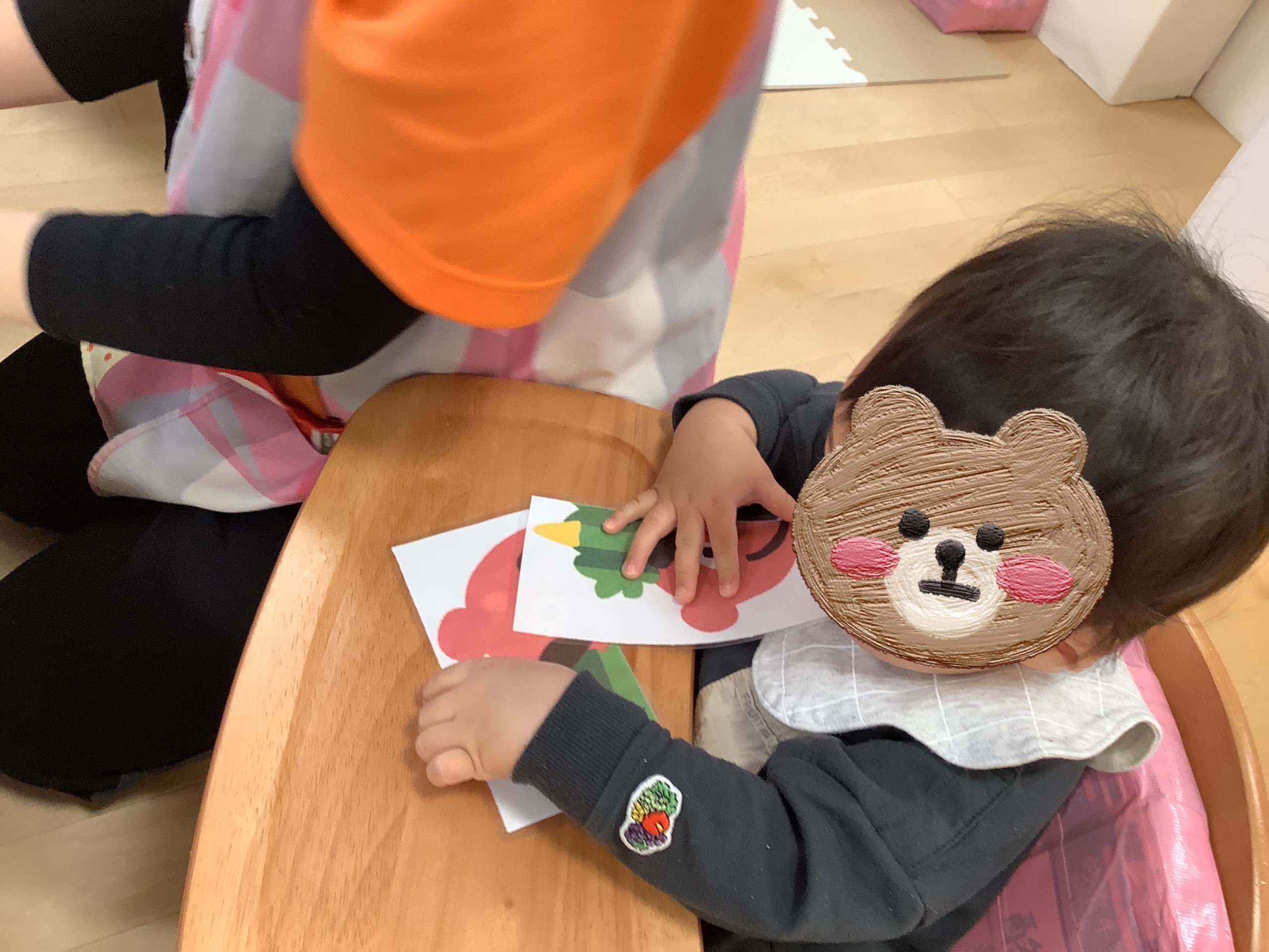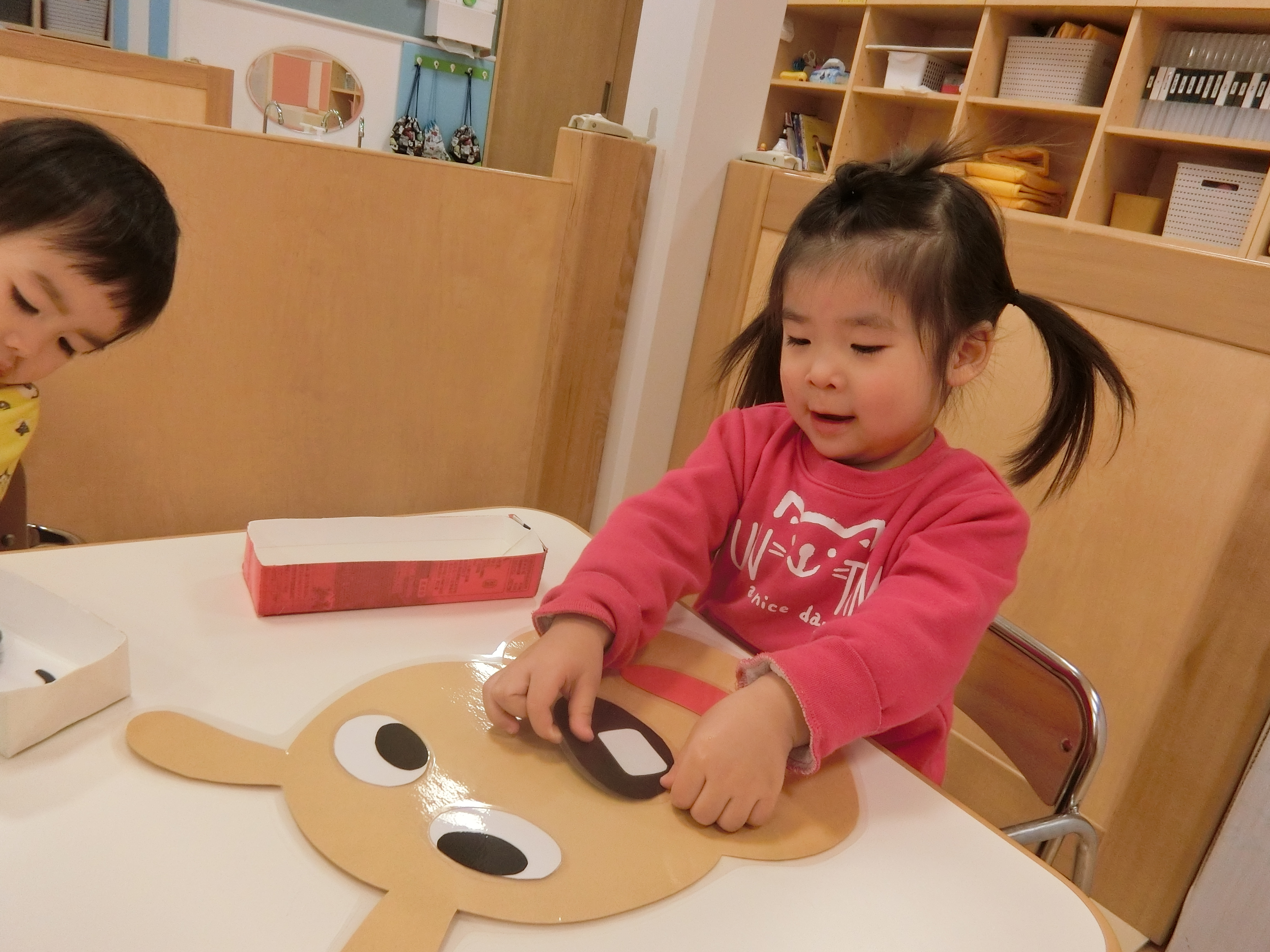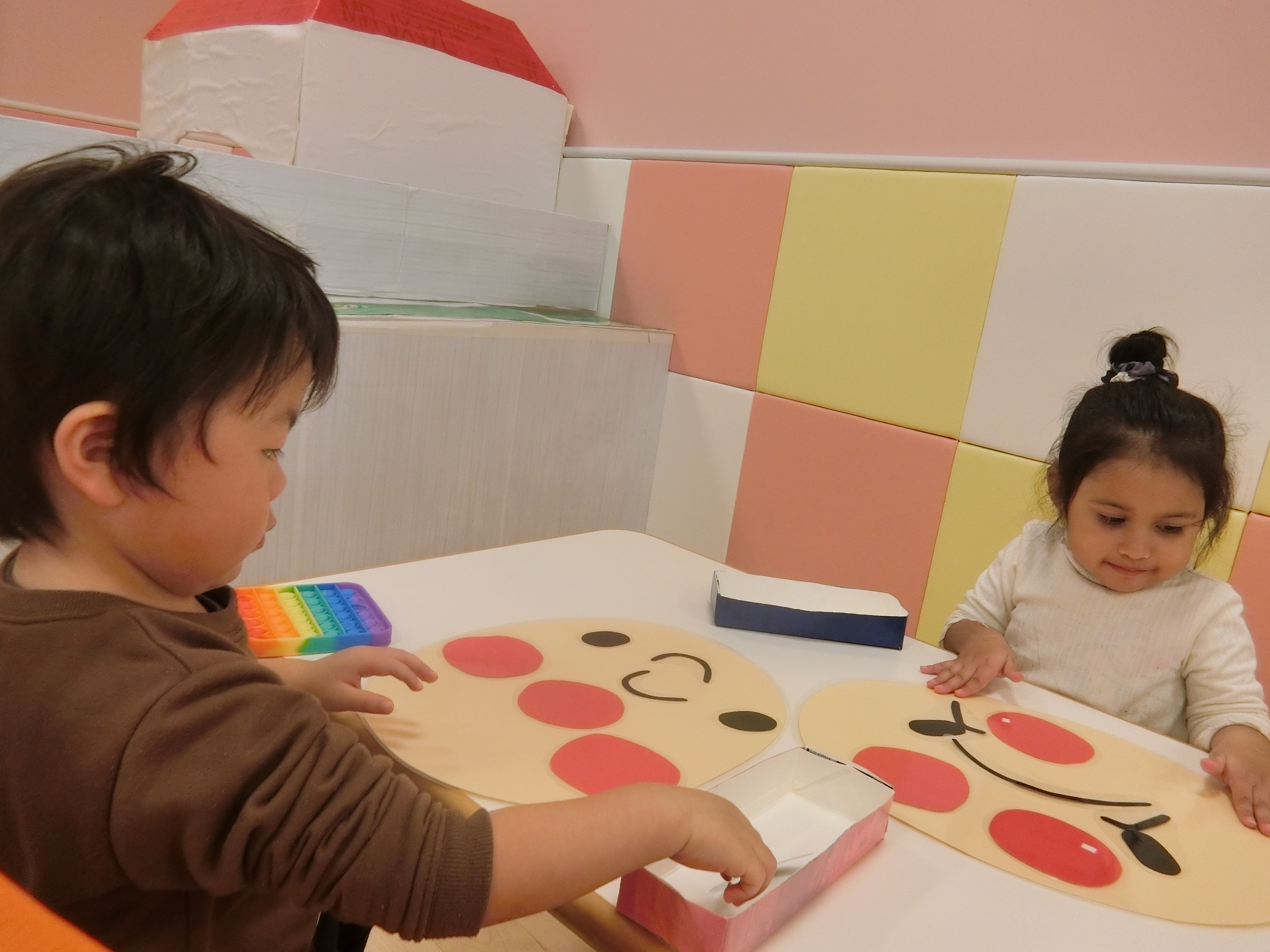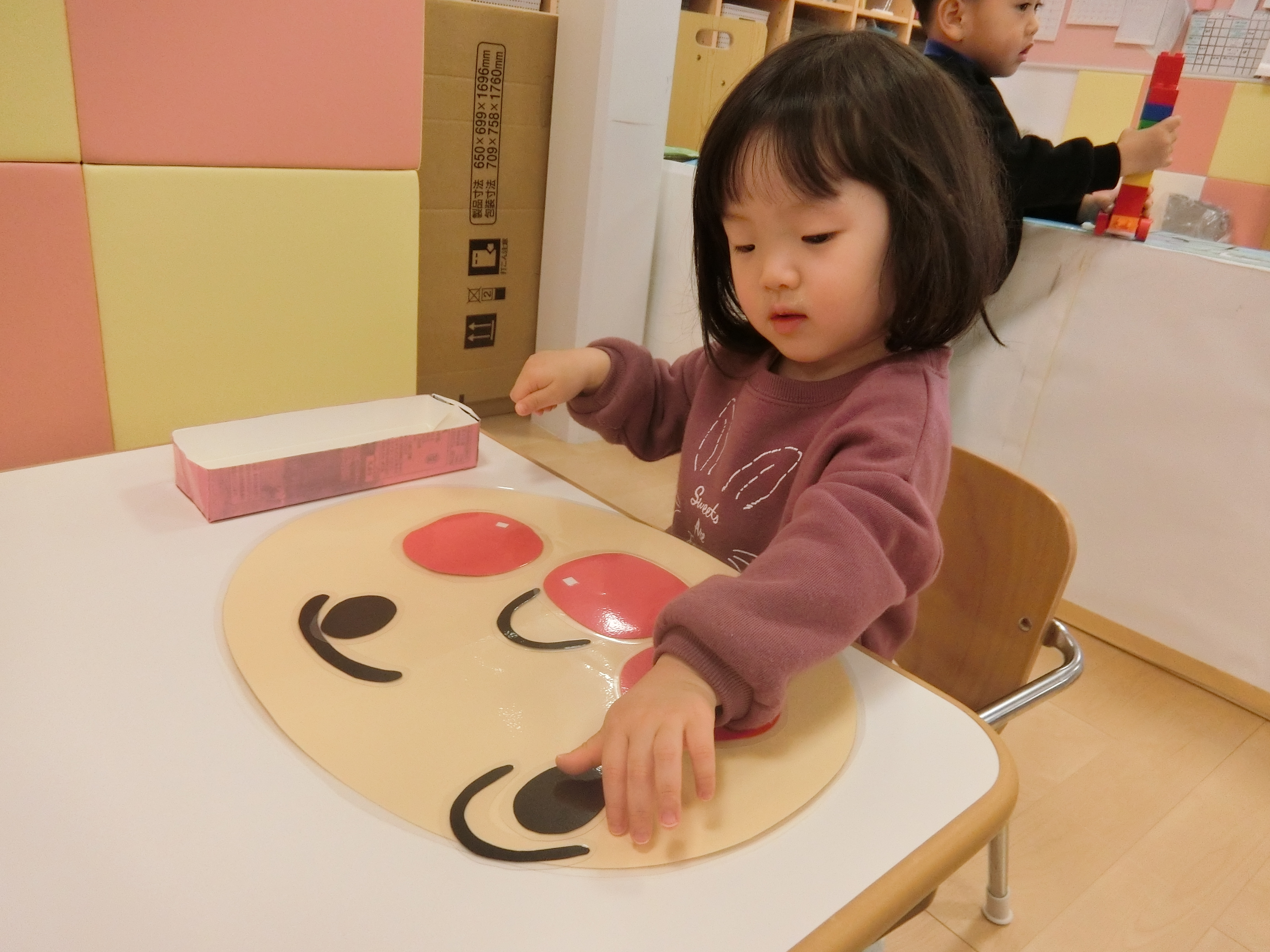 眉毛・目・鼻・ほっぺ・口‥それぞれのパーツを〝どこかなぁ〜??〟と考えながら置いています♫