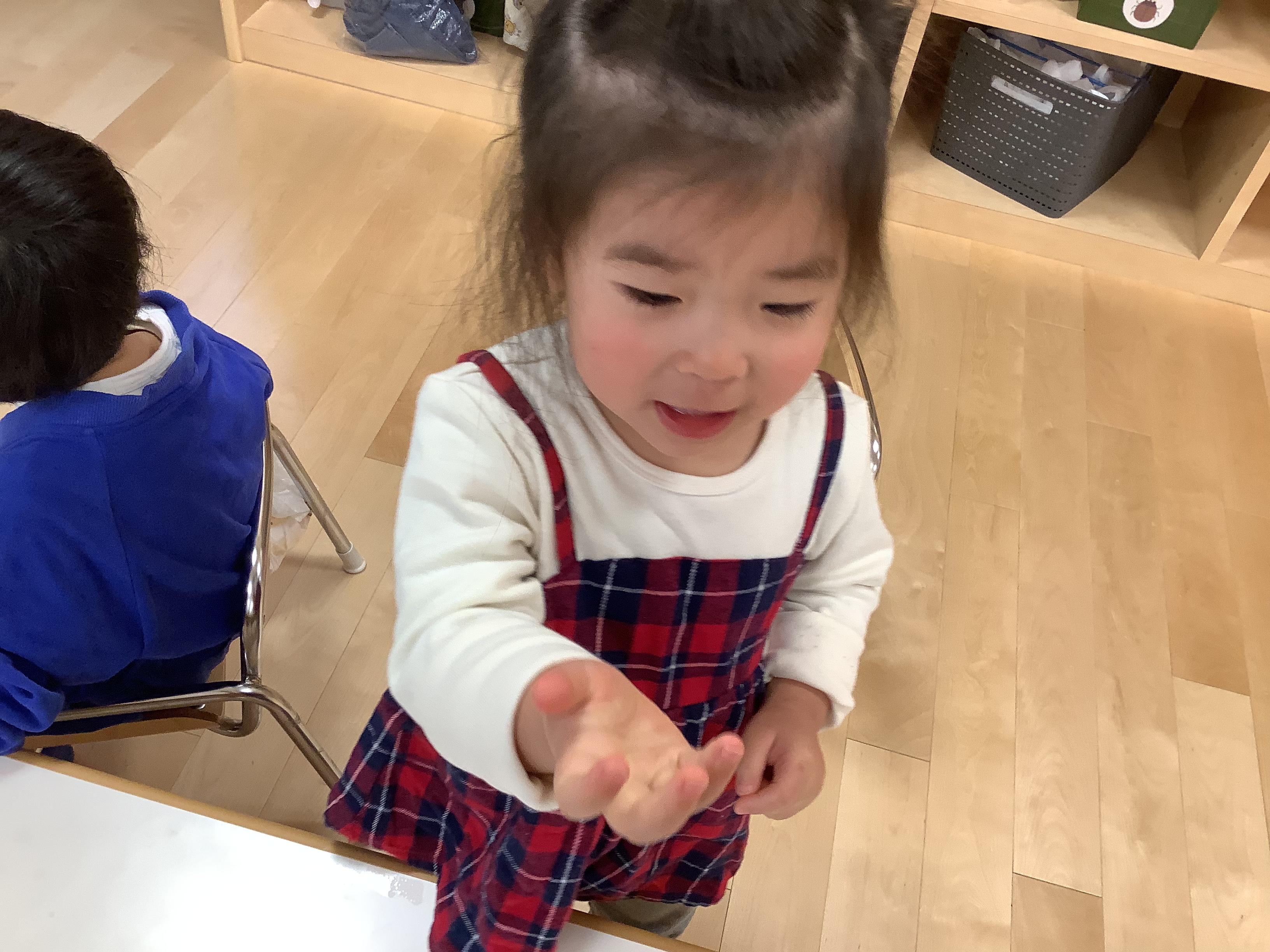 「冷たいよー!みてみて✨」と、本当に手のひらに氷がのっているかのように、保育者や友だちに見せにきて楽しむ姿もありました♬