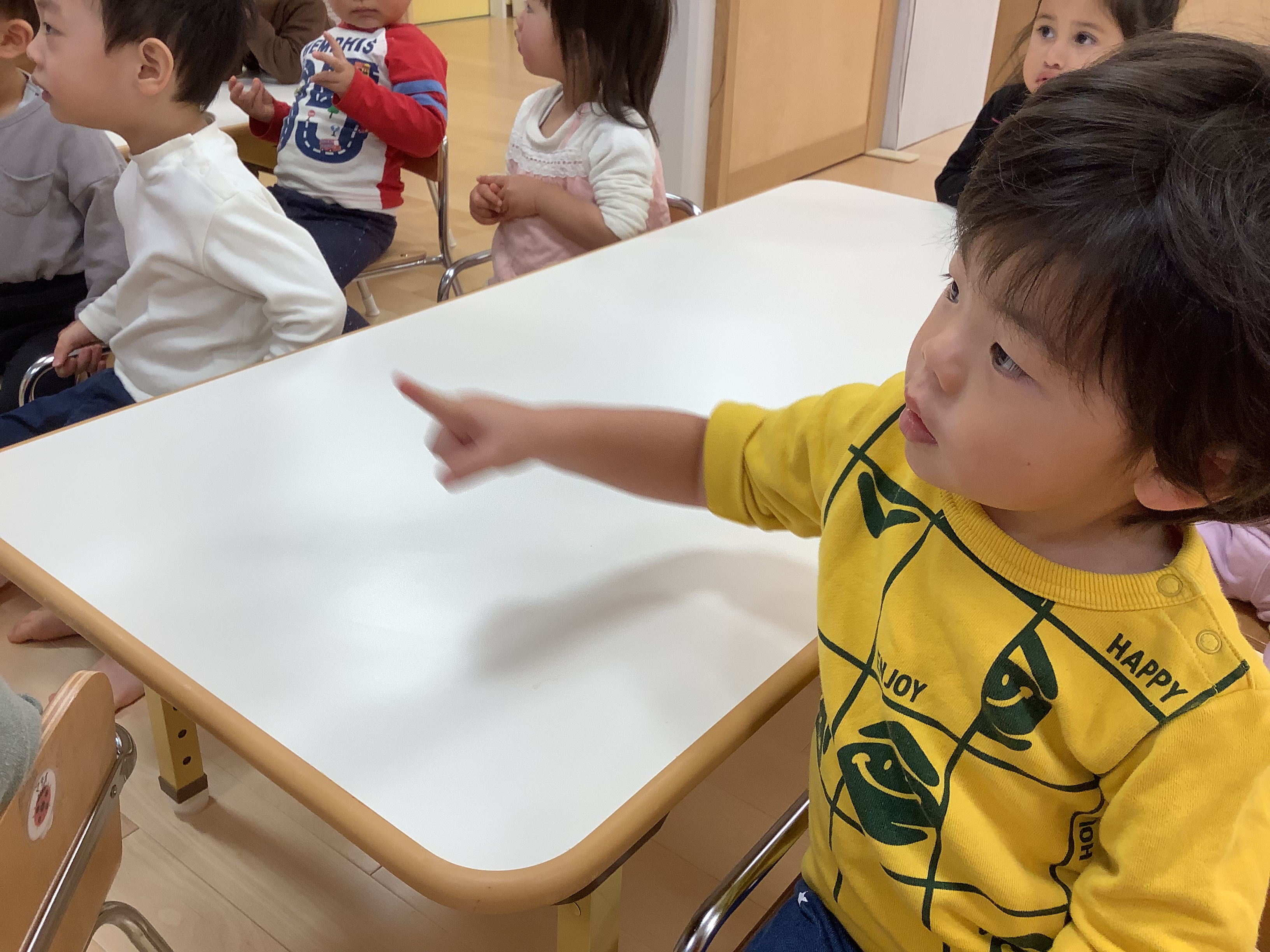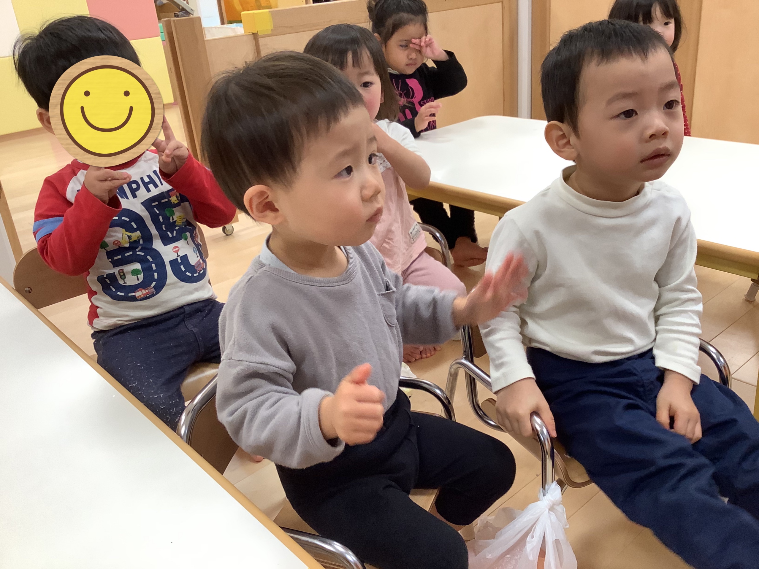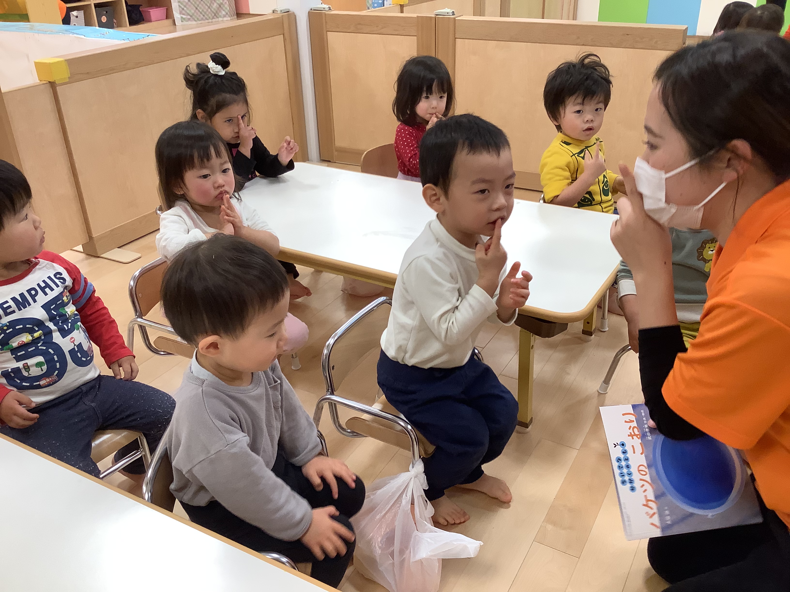 お話がはじまる前の手遊びの、最後の「しーっしーっしー❗️」のポーズがみんなとっても上手です(^^)