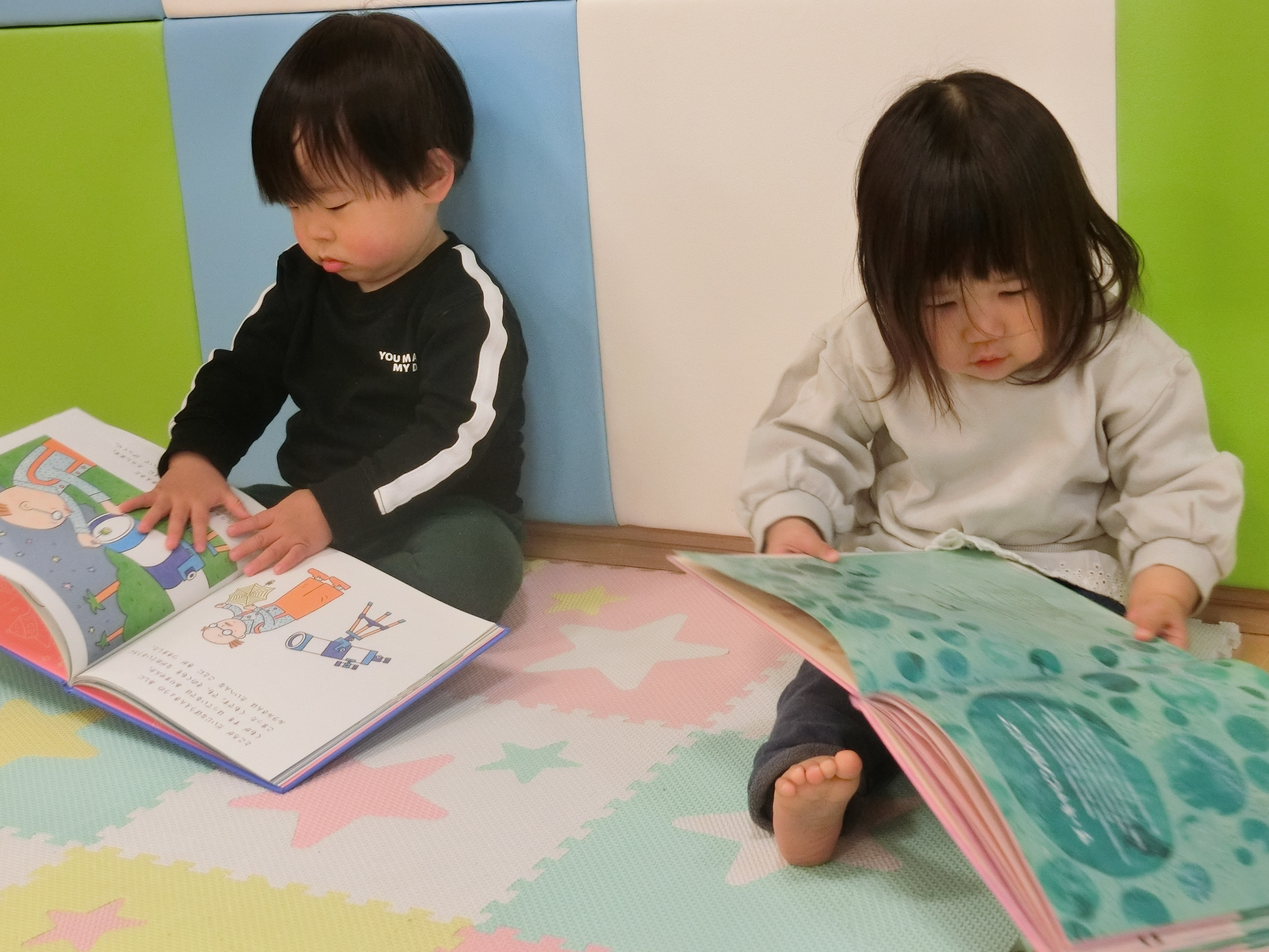 こちらが選んだ絵本を読み聞かせる場面もあれば、好きな絵本を自分で選んで読む時間も大切にしています(≧∀≦)♬