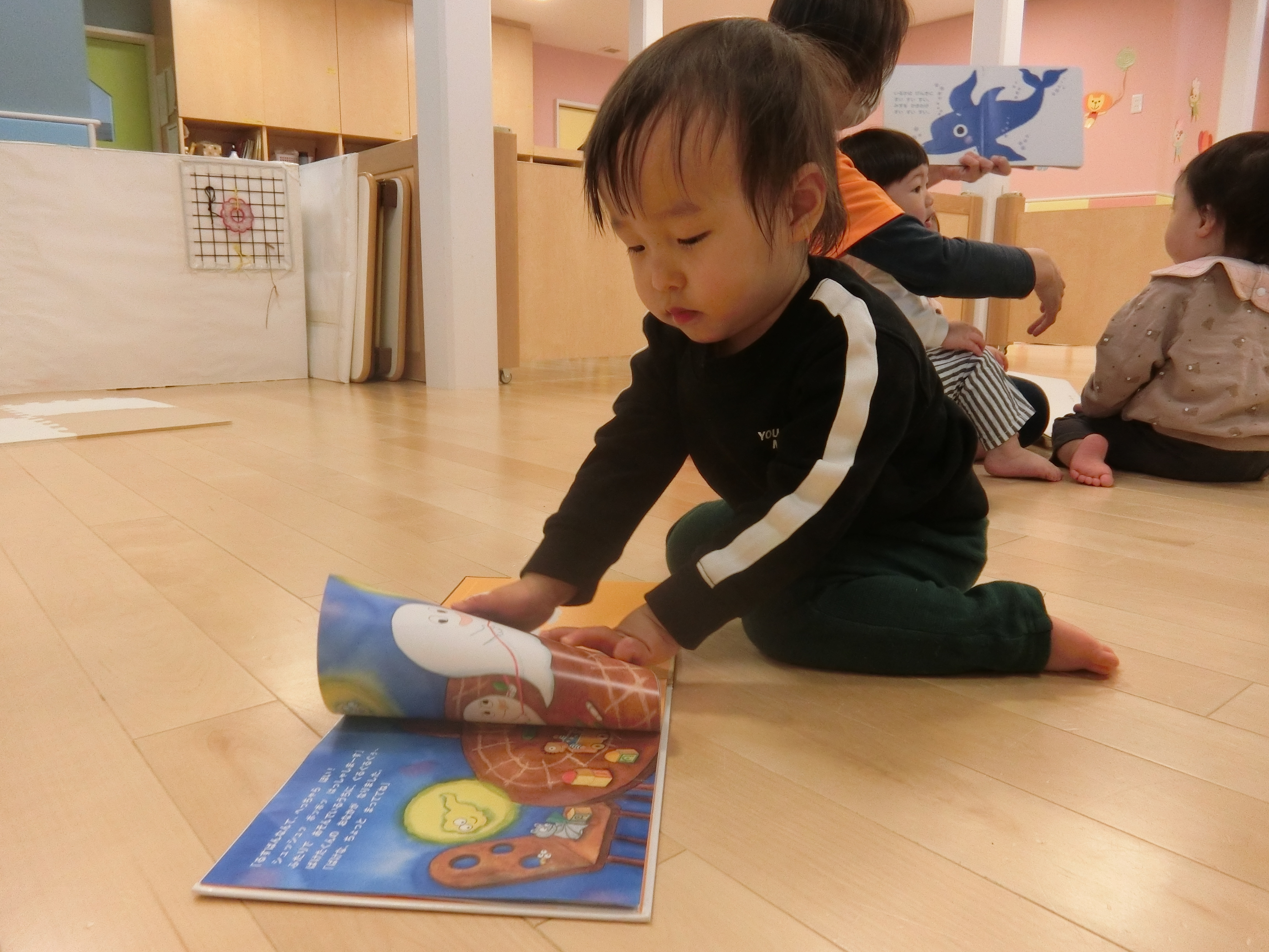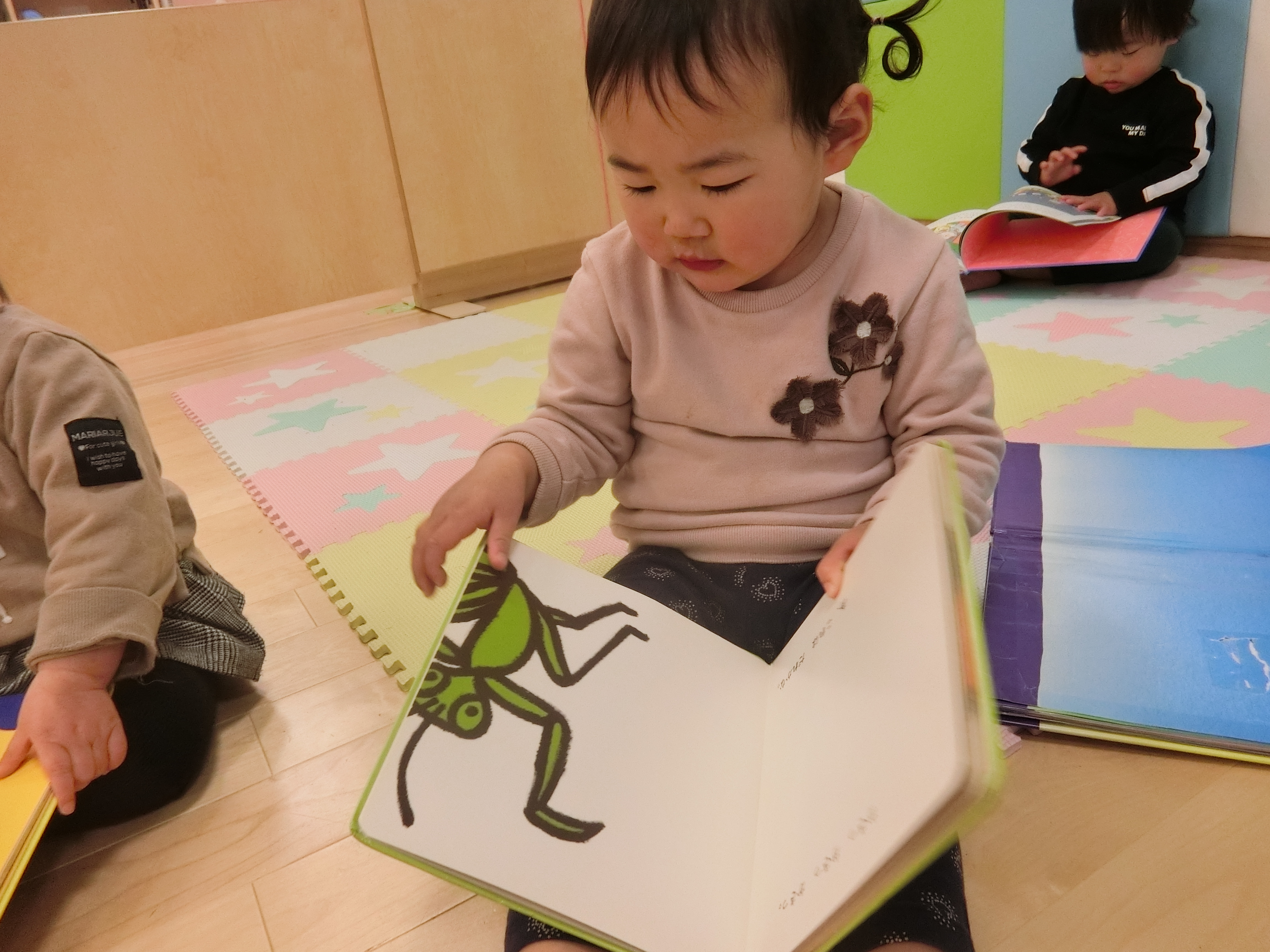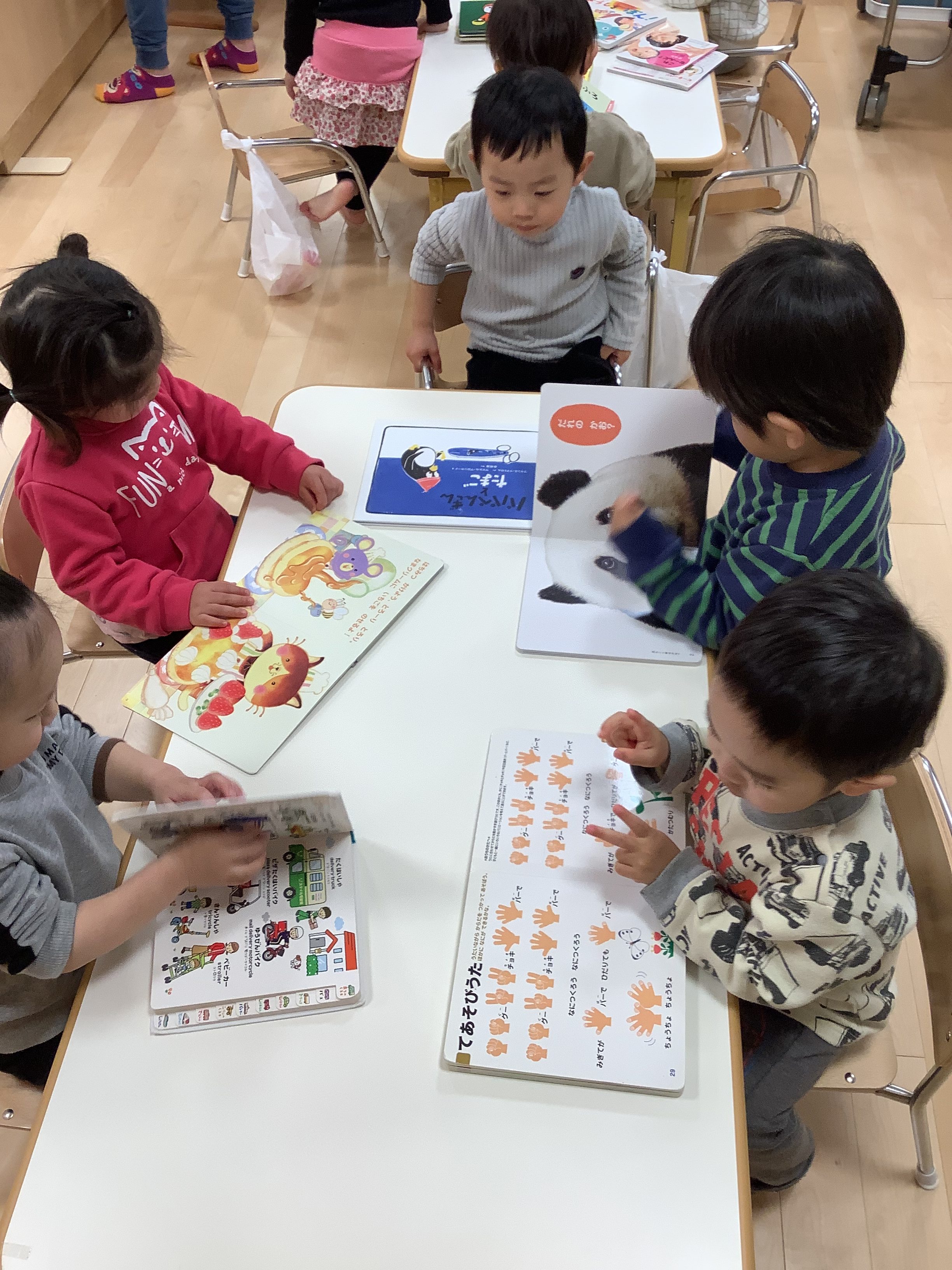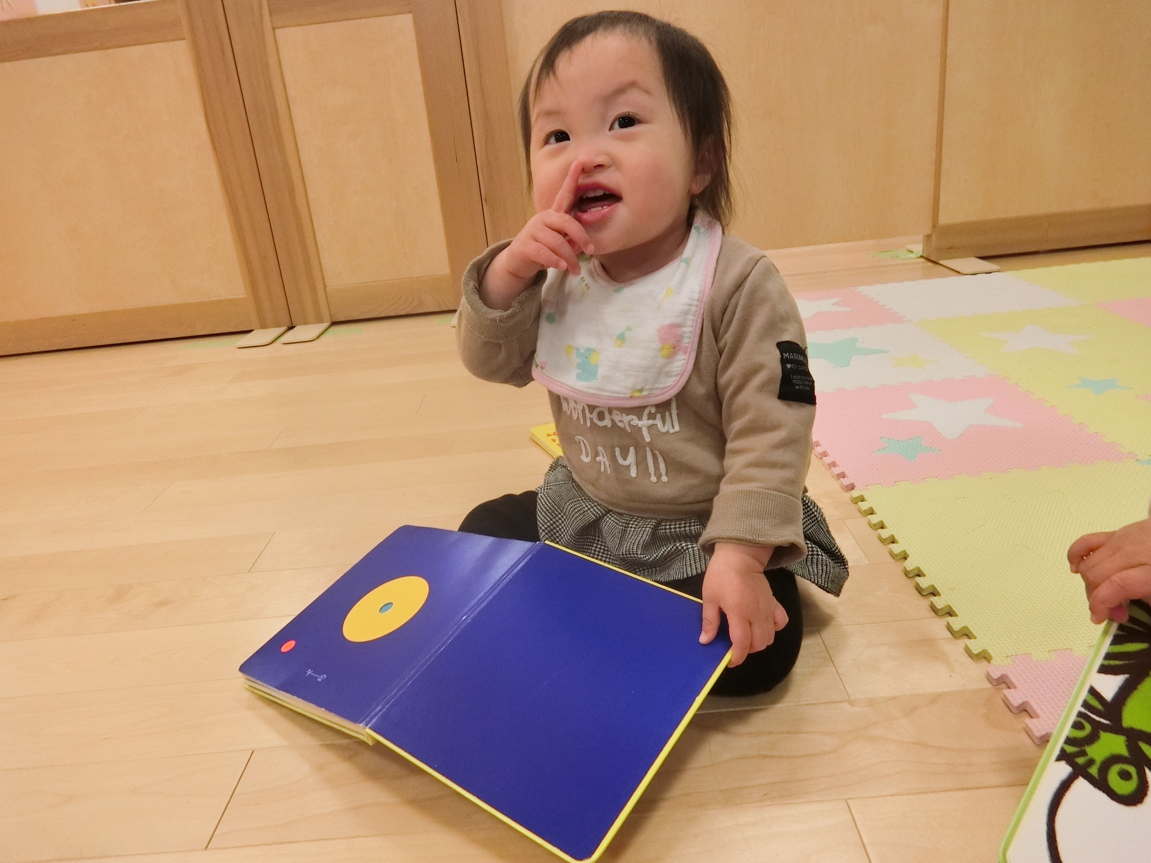 いつも保育者が絵本を読む前には手遊びをしていますが、マネっこ上手な0歳児のお友だちは〝しっしっしー?〟と、自分で読む前にもマネっこしていました♬