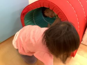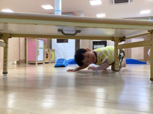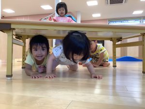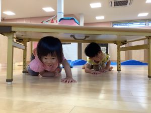机のトンネルも頭をぶつけないように子どもたち自身が意識して気をつけながら、体勢を低くしたりワニさん?になりきったりして、楽しくくぐっていました![]()