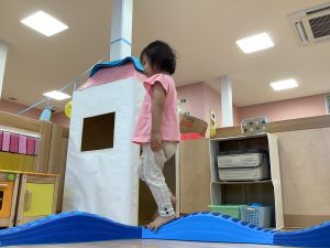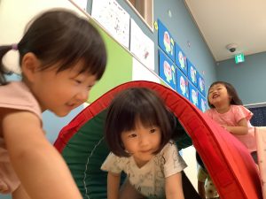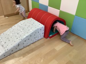 トンネルの通り道を大きくしたり小さくしたりすることで、どんな体勢で行けば良いのかを子どもたち自身で考えられるようにしました![]()