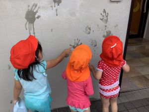 保育者が濡れた手で、壁に手をついたところに手型ができたのを見て、子どもたちもペタペタ手型をつけ始めました![]()