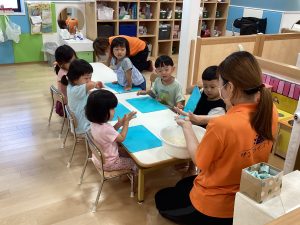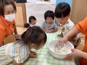 まずは先生が「お水と、小麦粉を混ぜ混ぜするね」