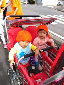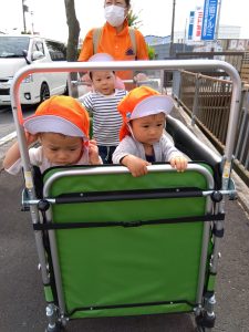 お散歩車にしっかり捕まって周りの景色を楽しみます