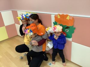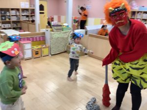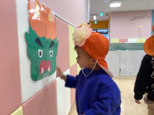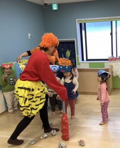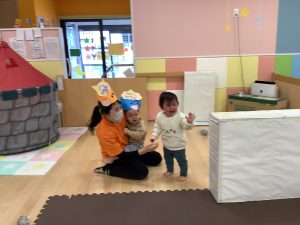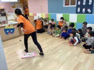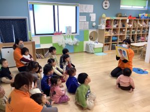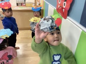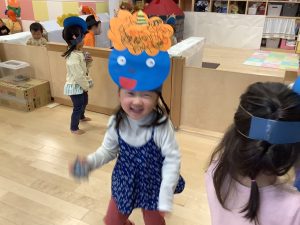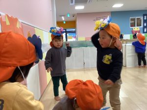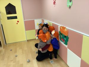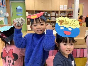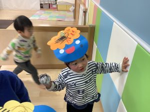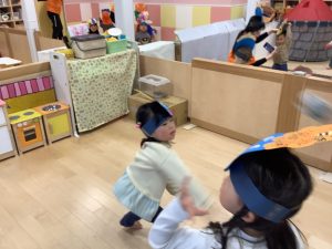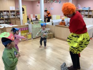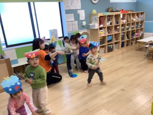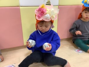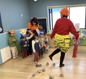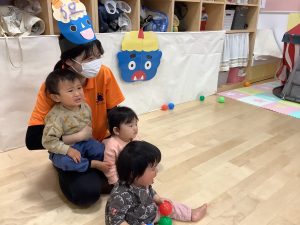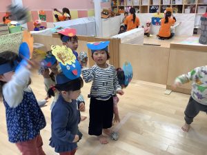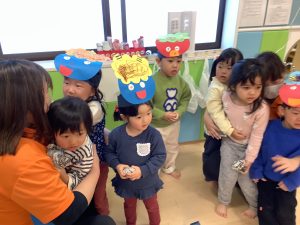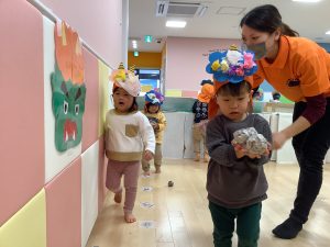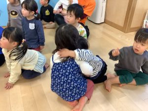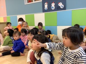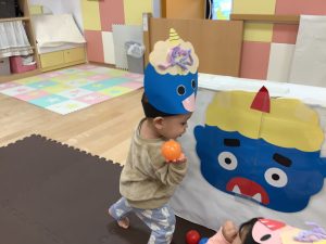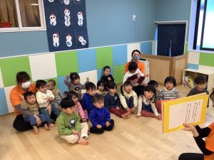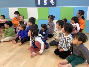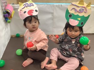 リトミックのカリキュラムの後に豆まきの歌をみんなで歌ってから節分の由来のお話を聞きました