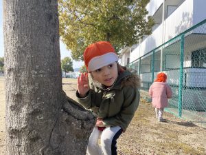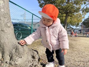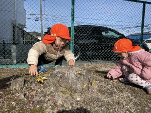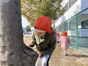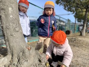 木の窪みのところにドングリを入れる子どもたち![]()