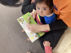 森の音楽家の絵本を見て太鼓を叩く真似をしながら楽しんでくれていました