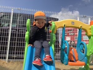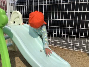 見つけた葉っぱを滑り台に置いて滑らせる遊びが楽しかったようで繰り返し楽しんでくれていました